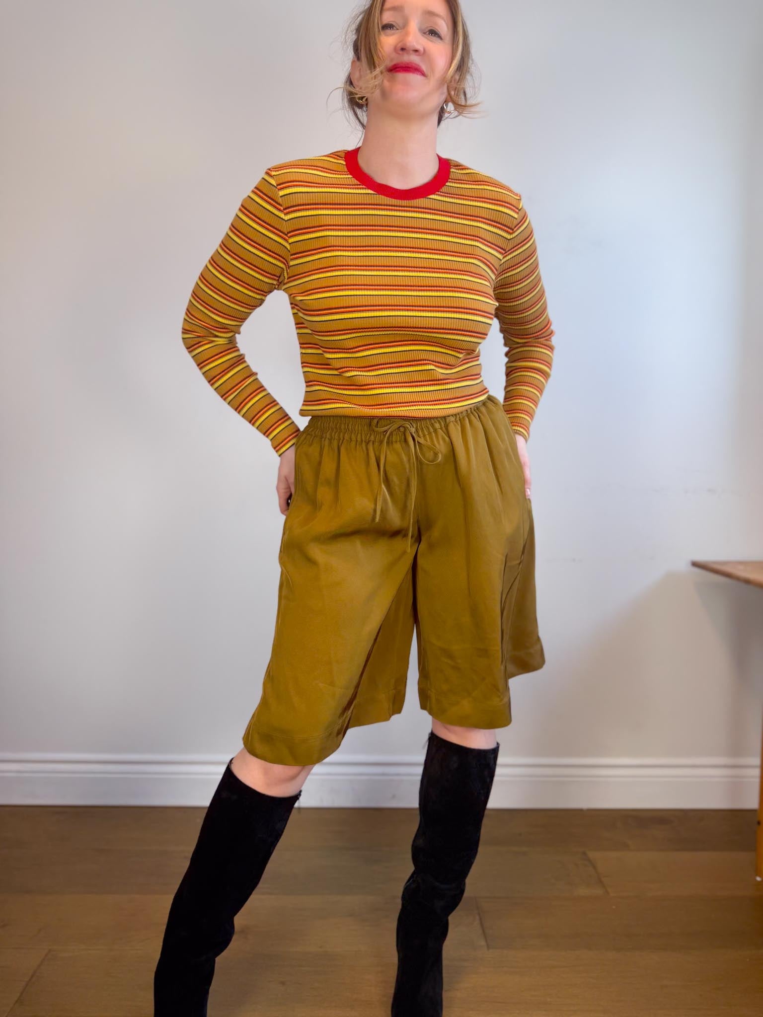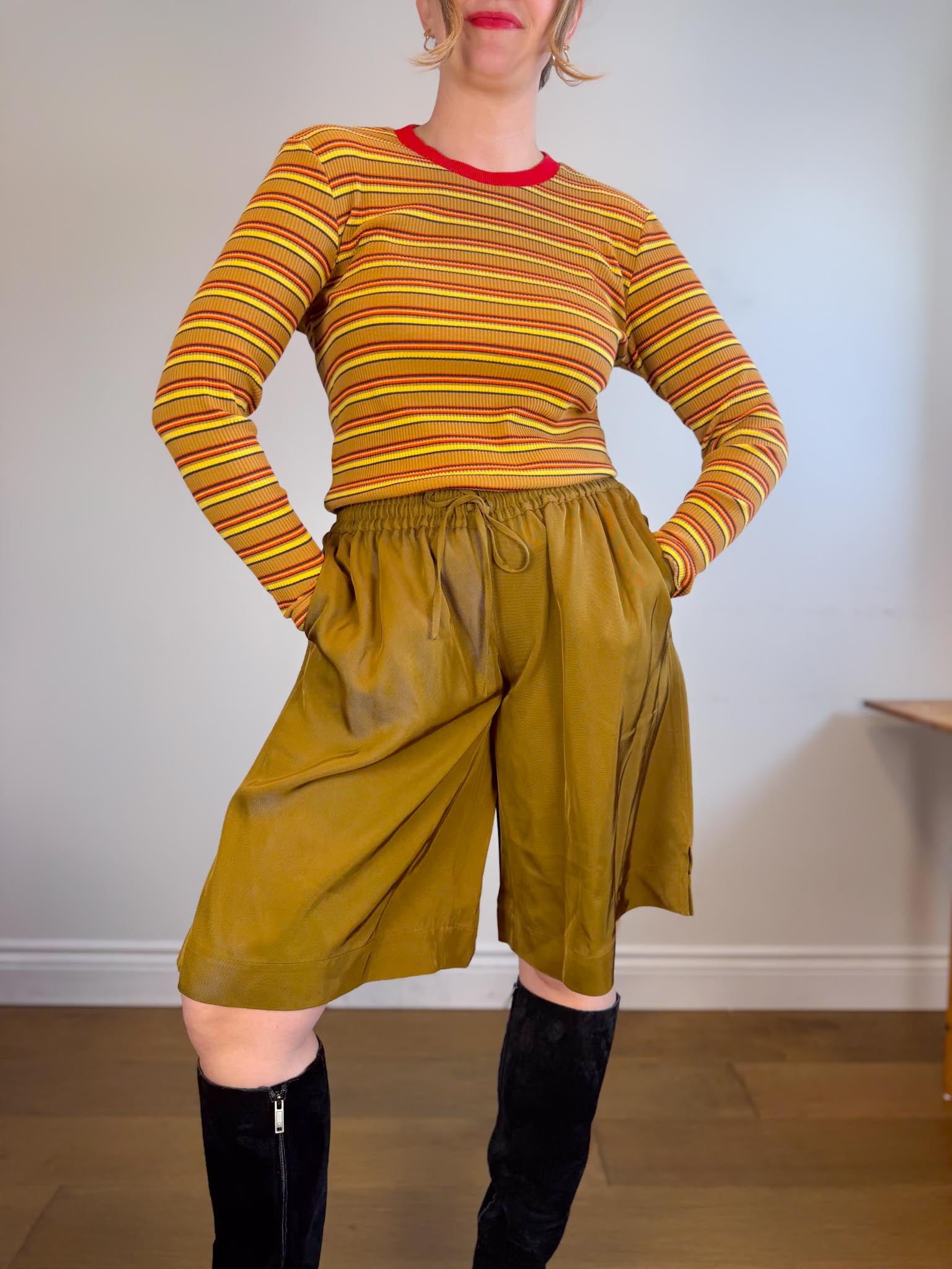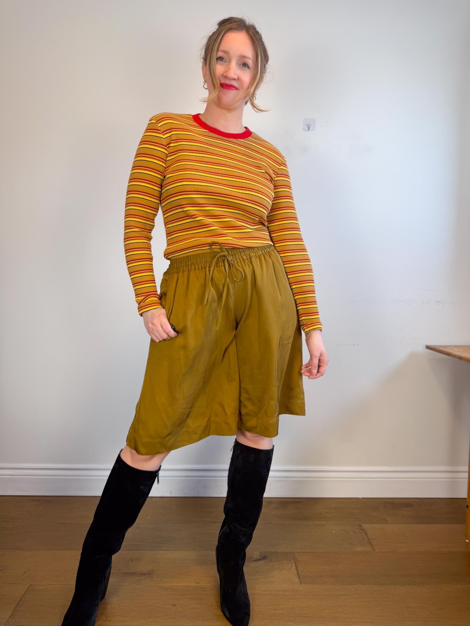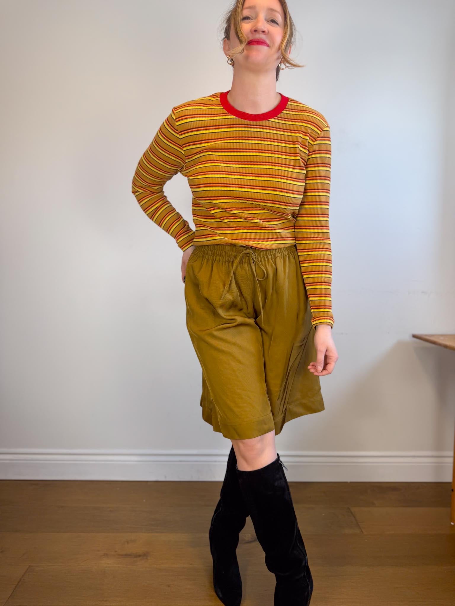 For sizing reference in the photos above, I am 5’9 and usually wear a M-L in tops and a size L / 10-12 depending on the brand in bottoms. My measurements are as follows: bust is 37/38” waist is 32” and hips are 43”. My Mom is 5’5 and usually wears a size small in tops and size 4 in bottoms depending on the brand. Her measurements are as follows: bust is 32” , her waist is 28” and her hips are 36.5”.