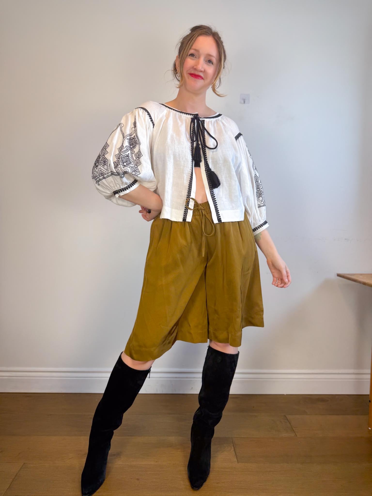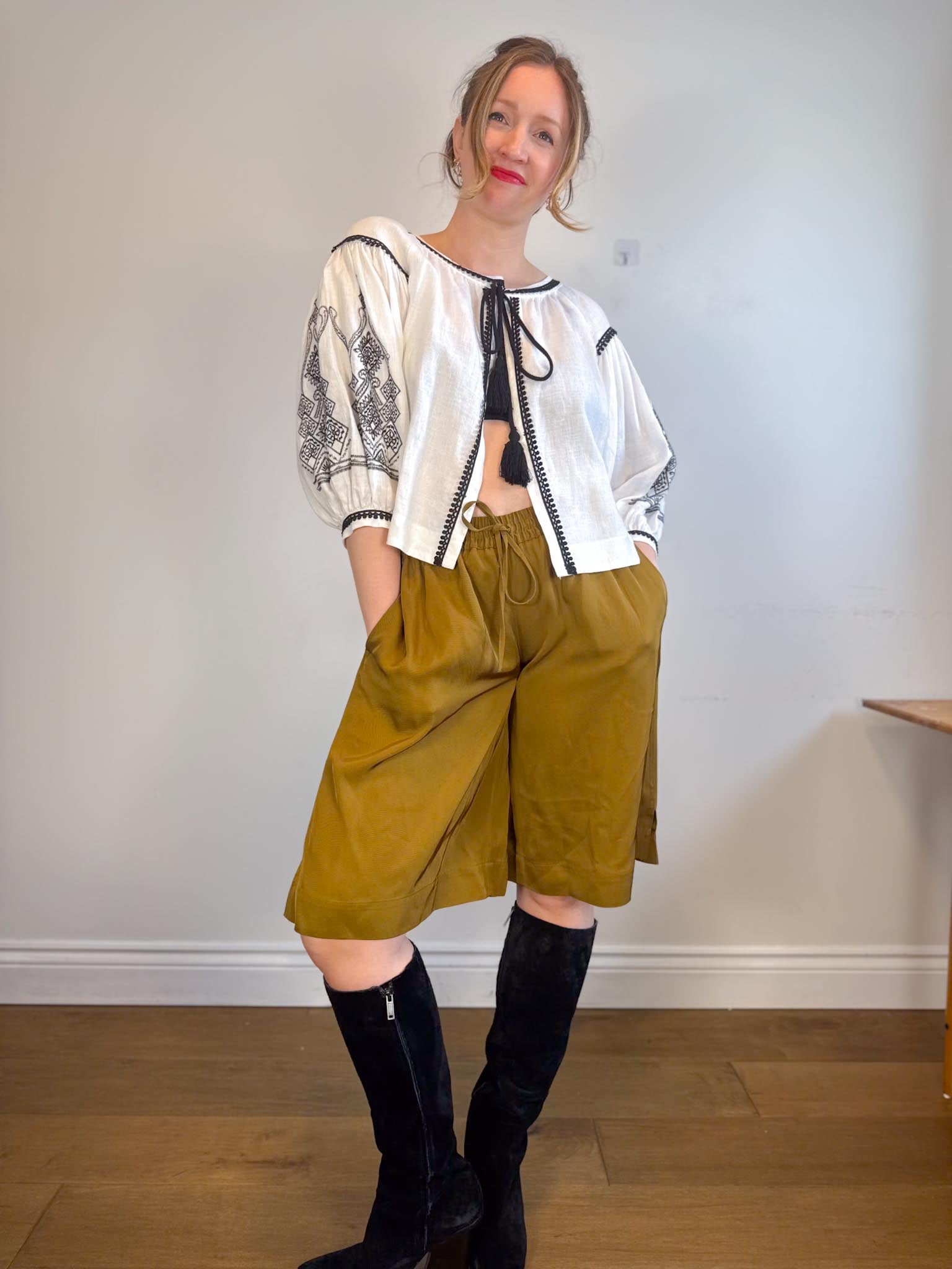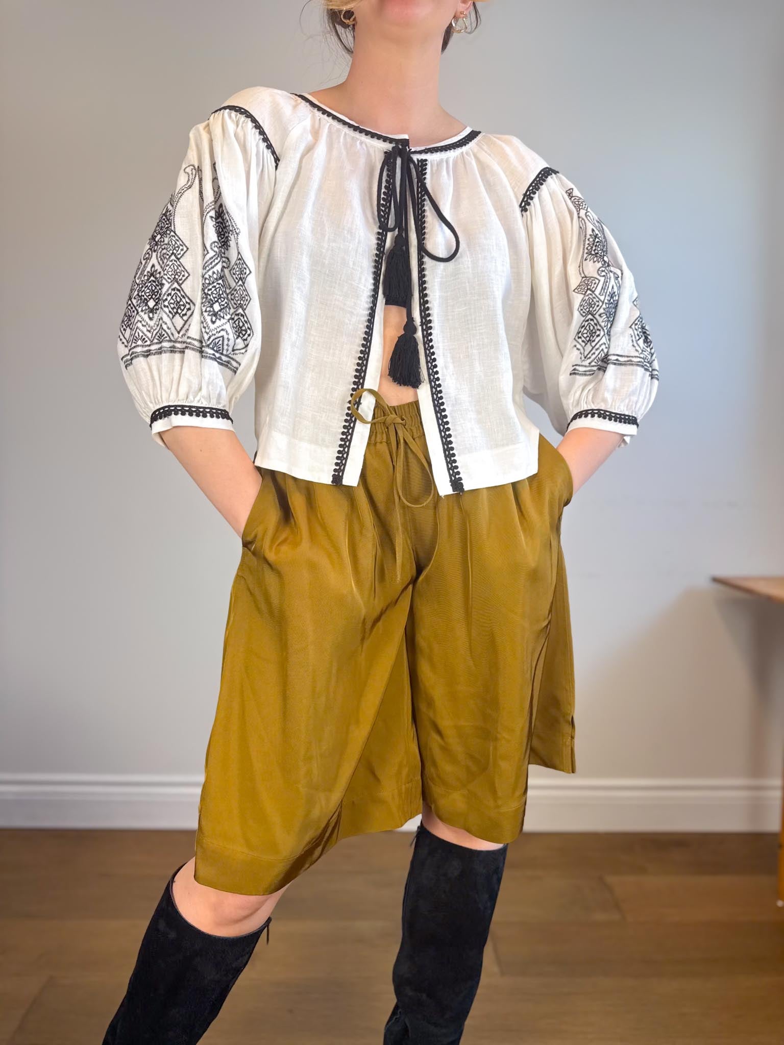 AGGEL Linen Embroidered Front Tie Blouse (Size M/L)