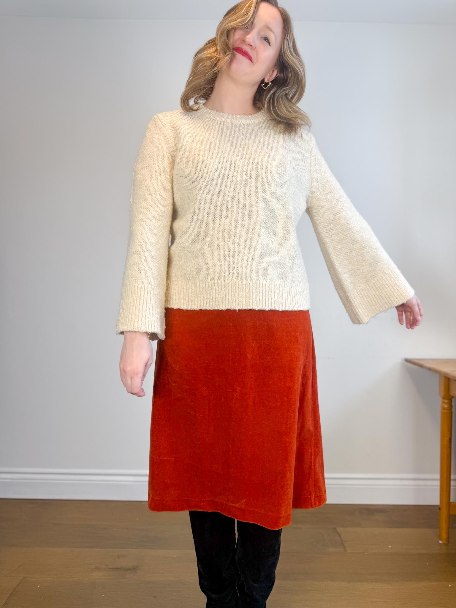 For sizing reference in the photos above, I am 5’9 and usually wear a M-L in tops and a size L / 10-12 depending on the brand in bottoms. My measurements are as follows: bust is 37/38” waist is 32” and hips are 43”. My Mom is 5’5 and usually wears a size small in tops and size 4 in bottoms depending on the brand. Her measurements are as follows: bust is 32” , her waist is 28” and her hips are 36.5”.