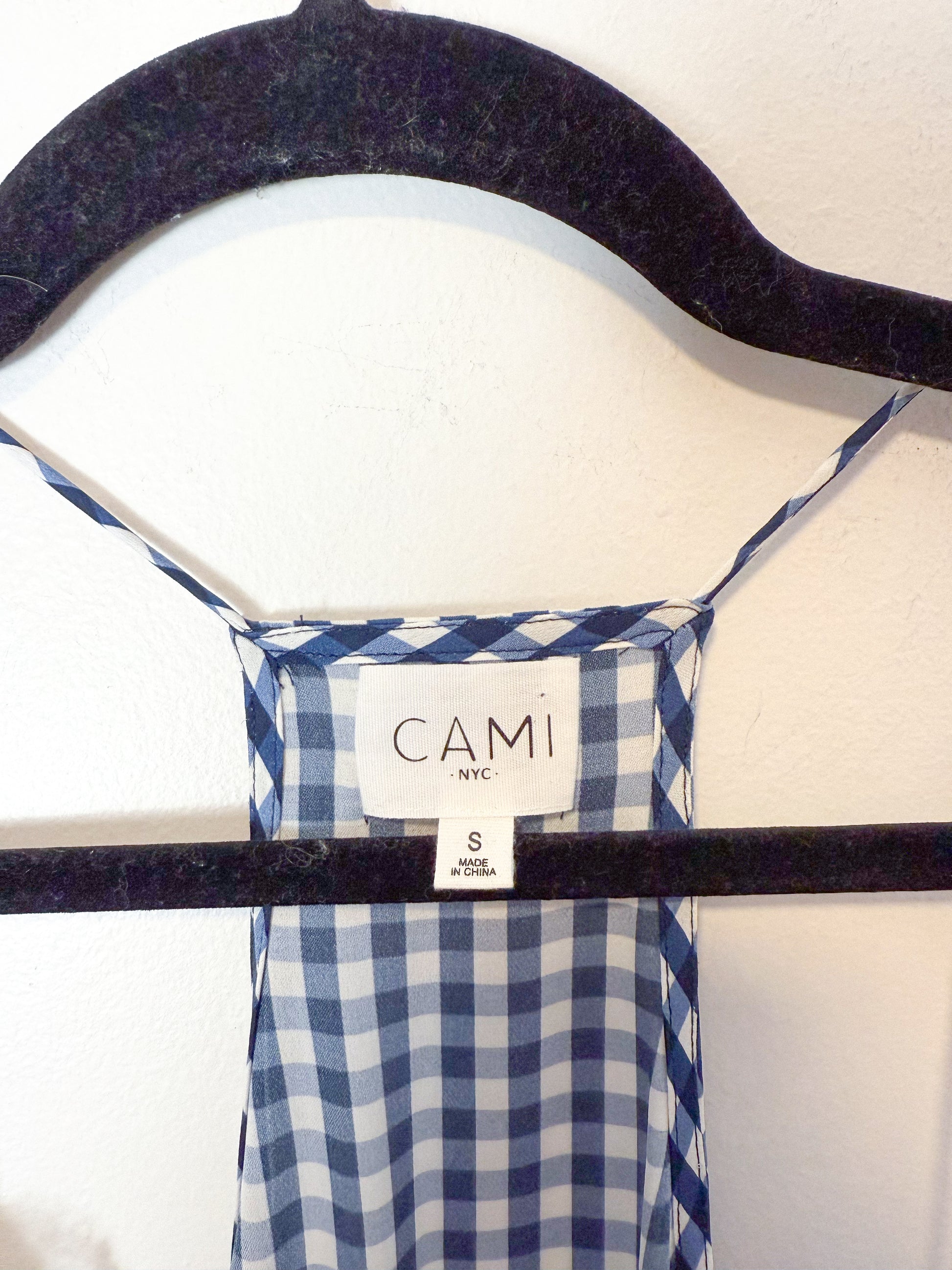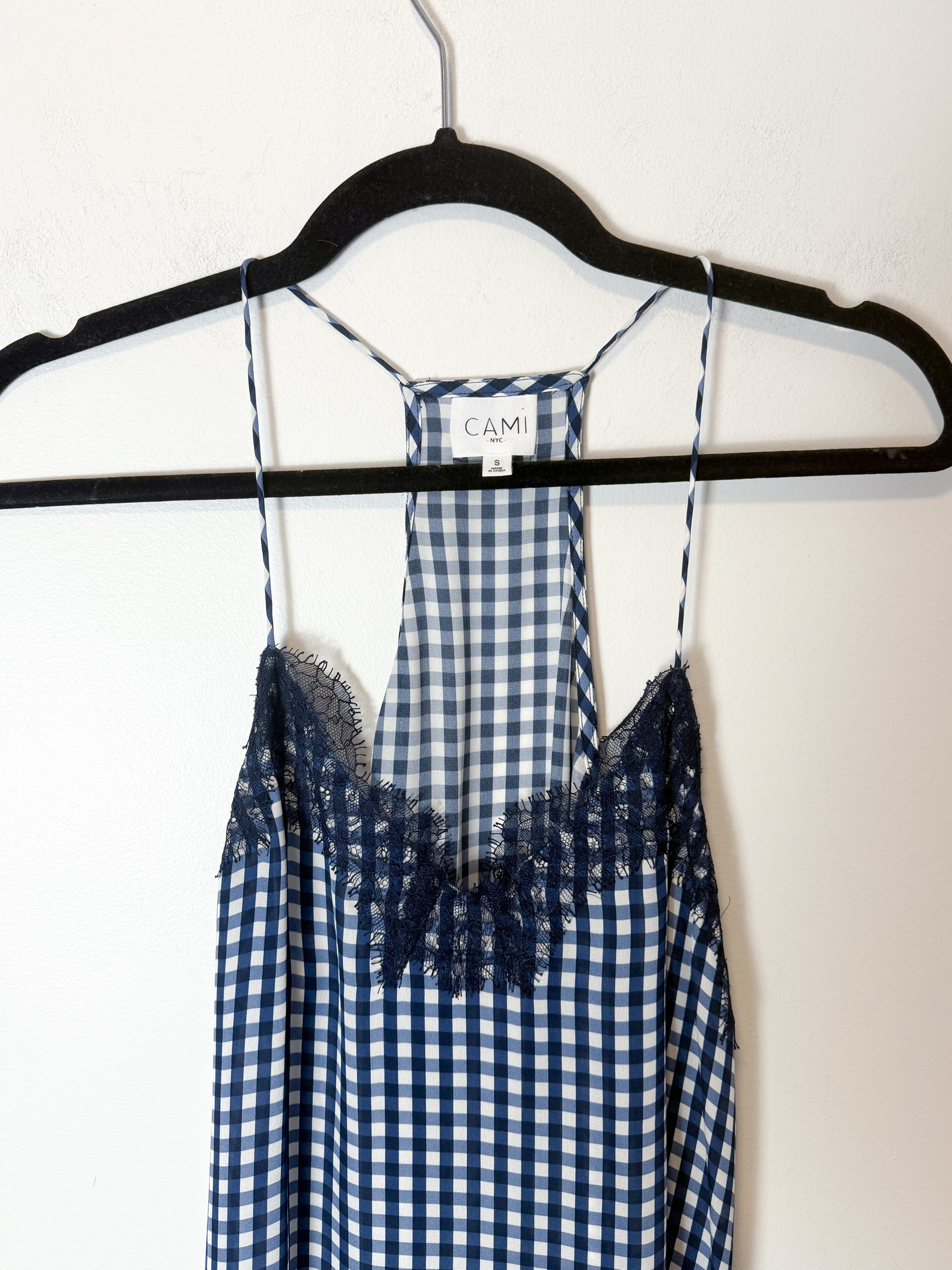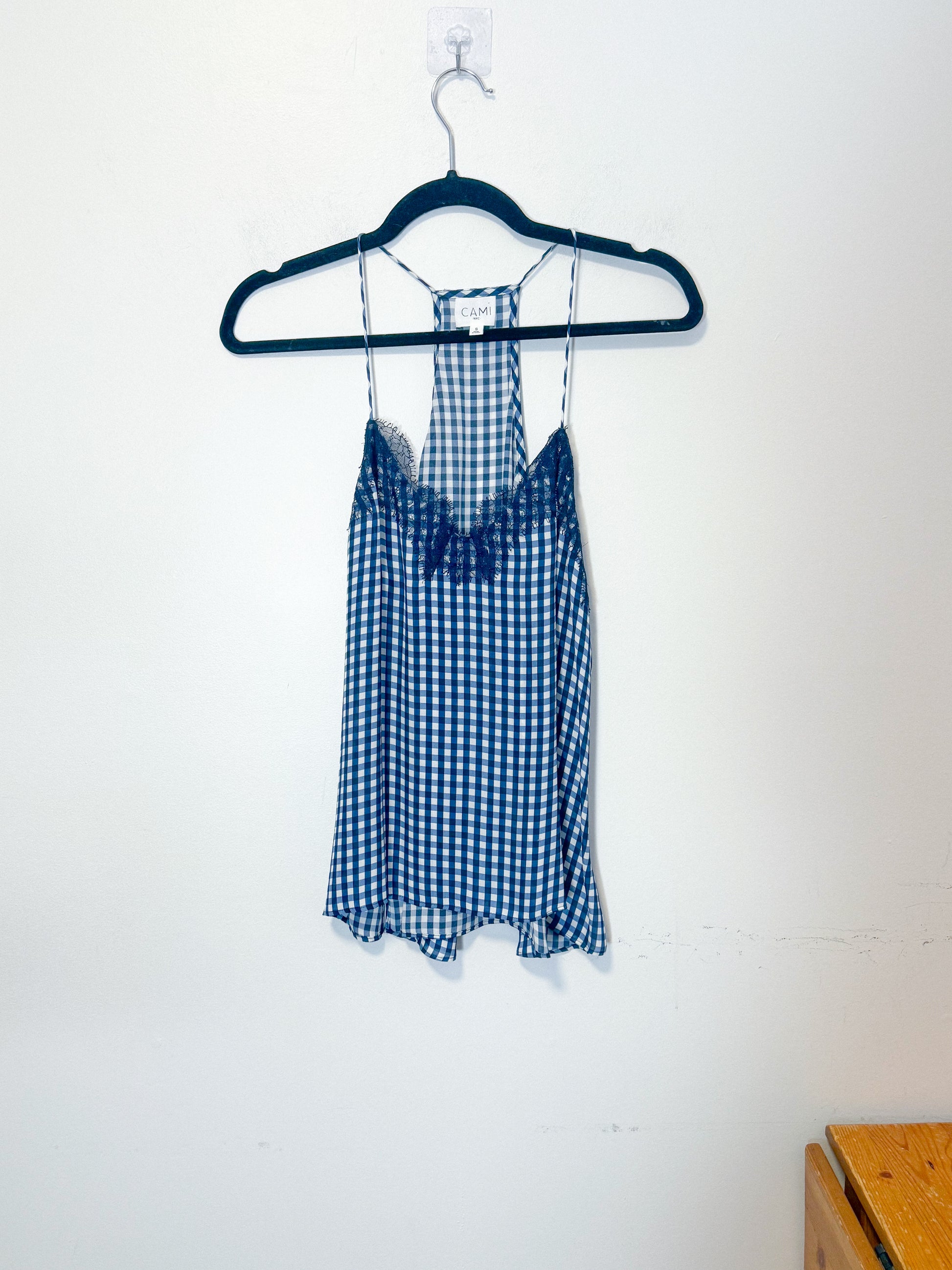CAMI NYC "Racer Charmeuse Silk Camisole in Blue/White Check" (Size S)