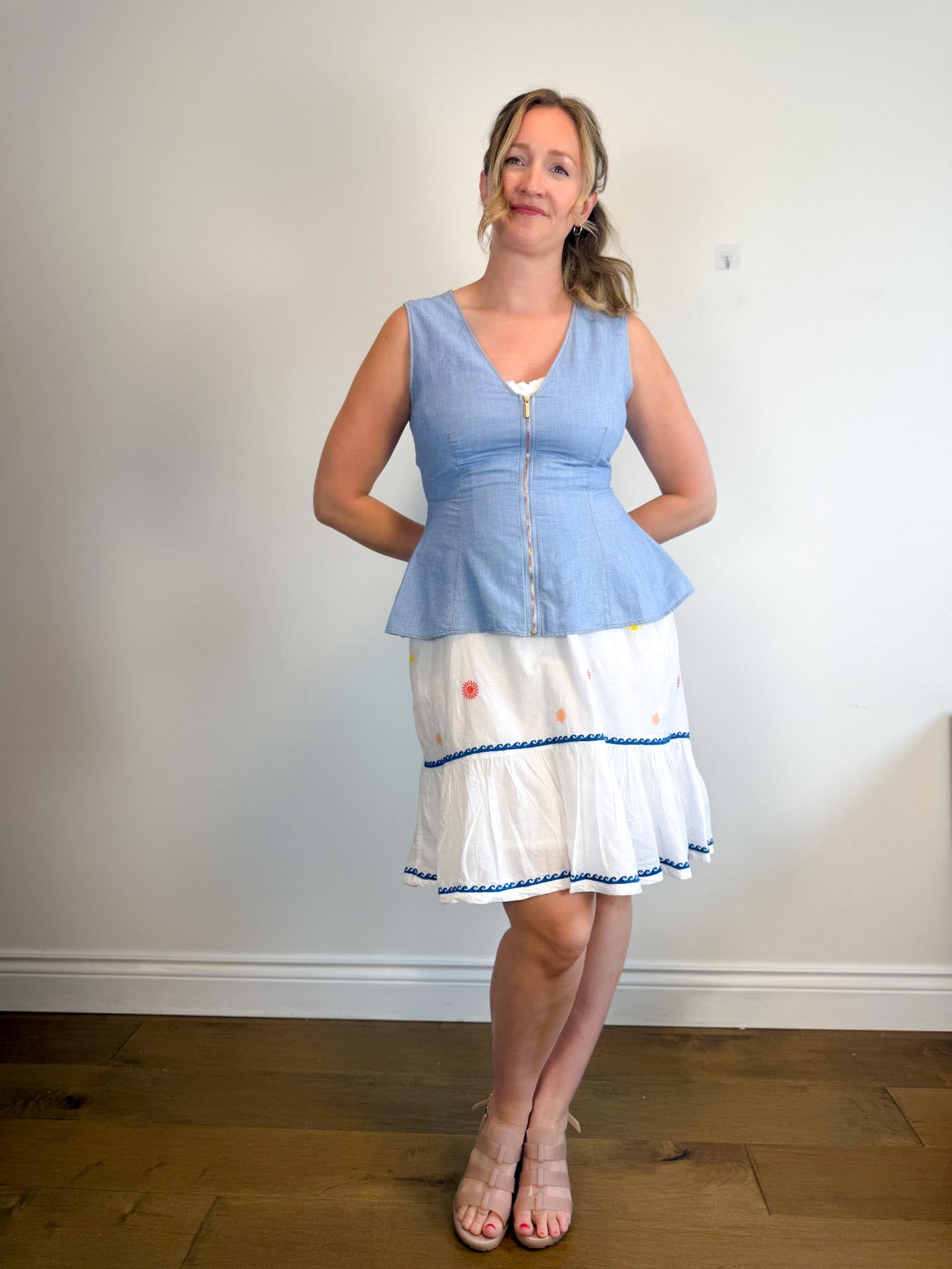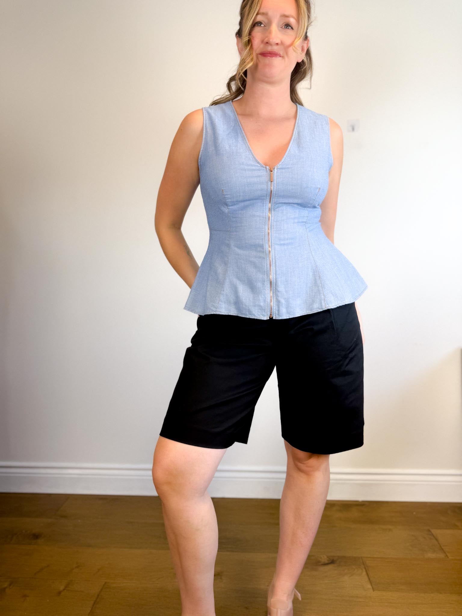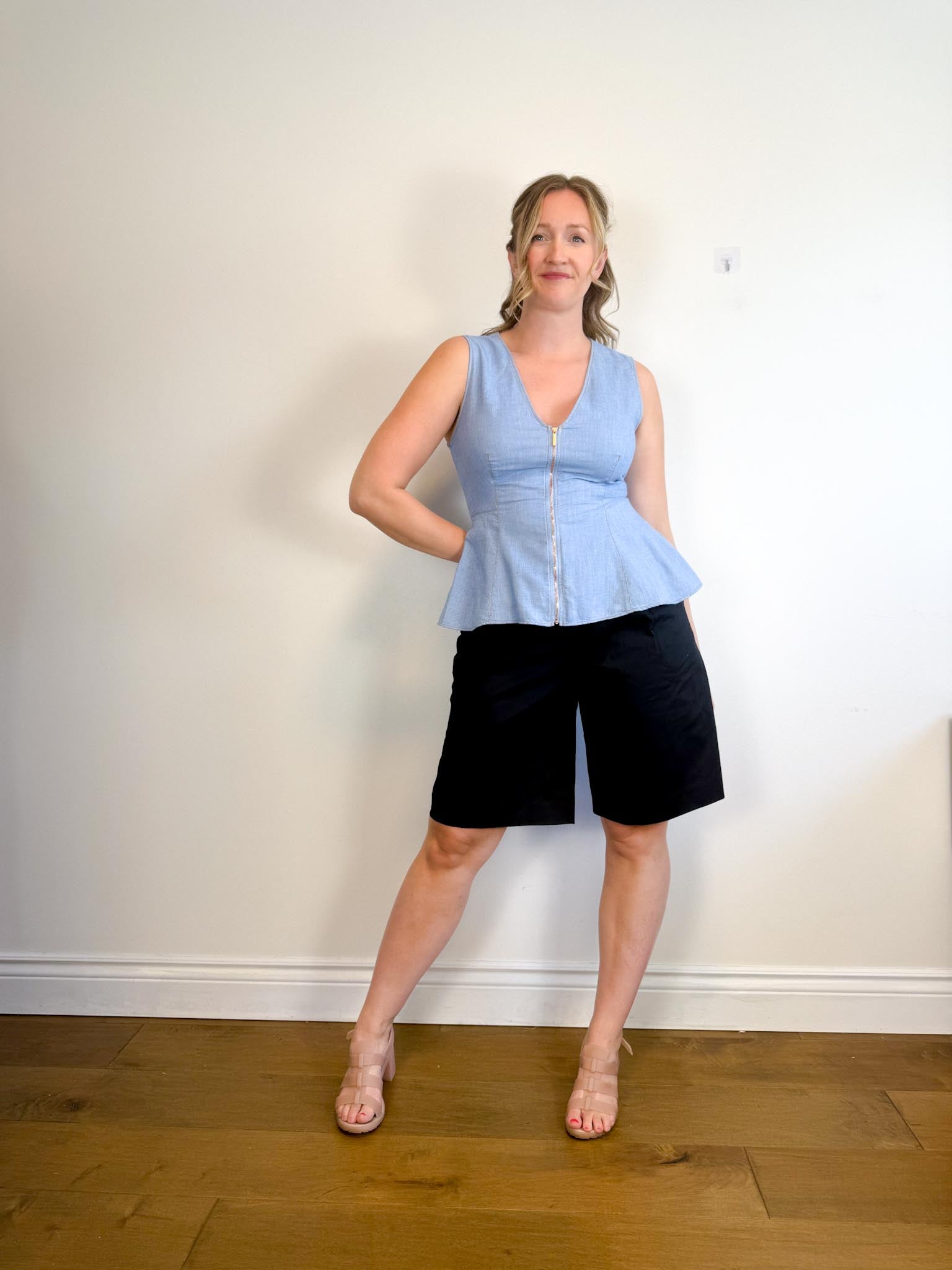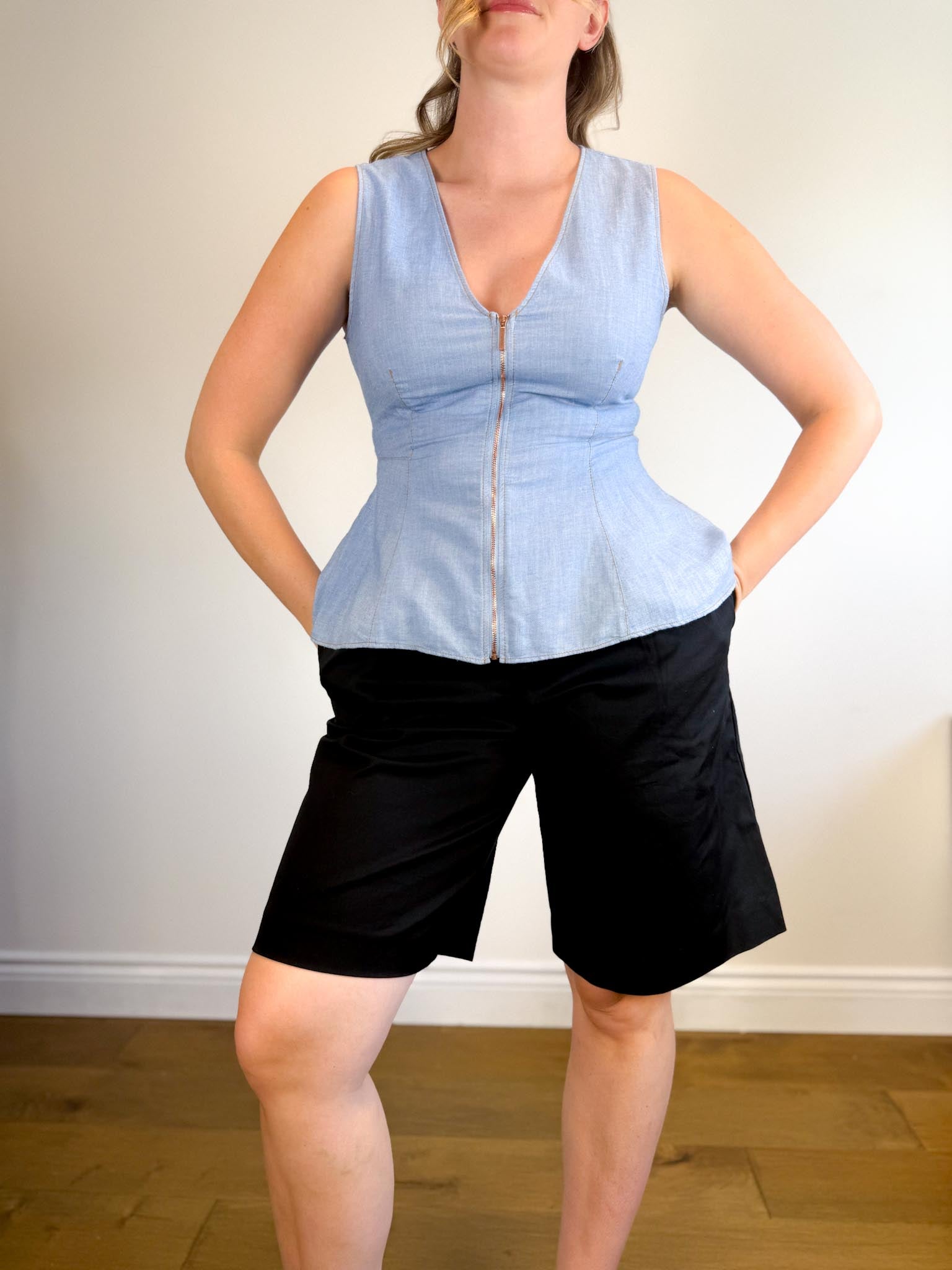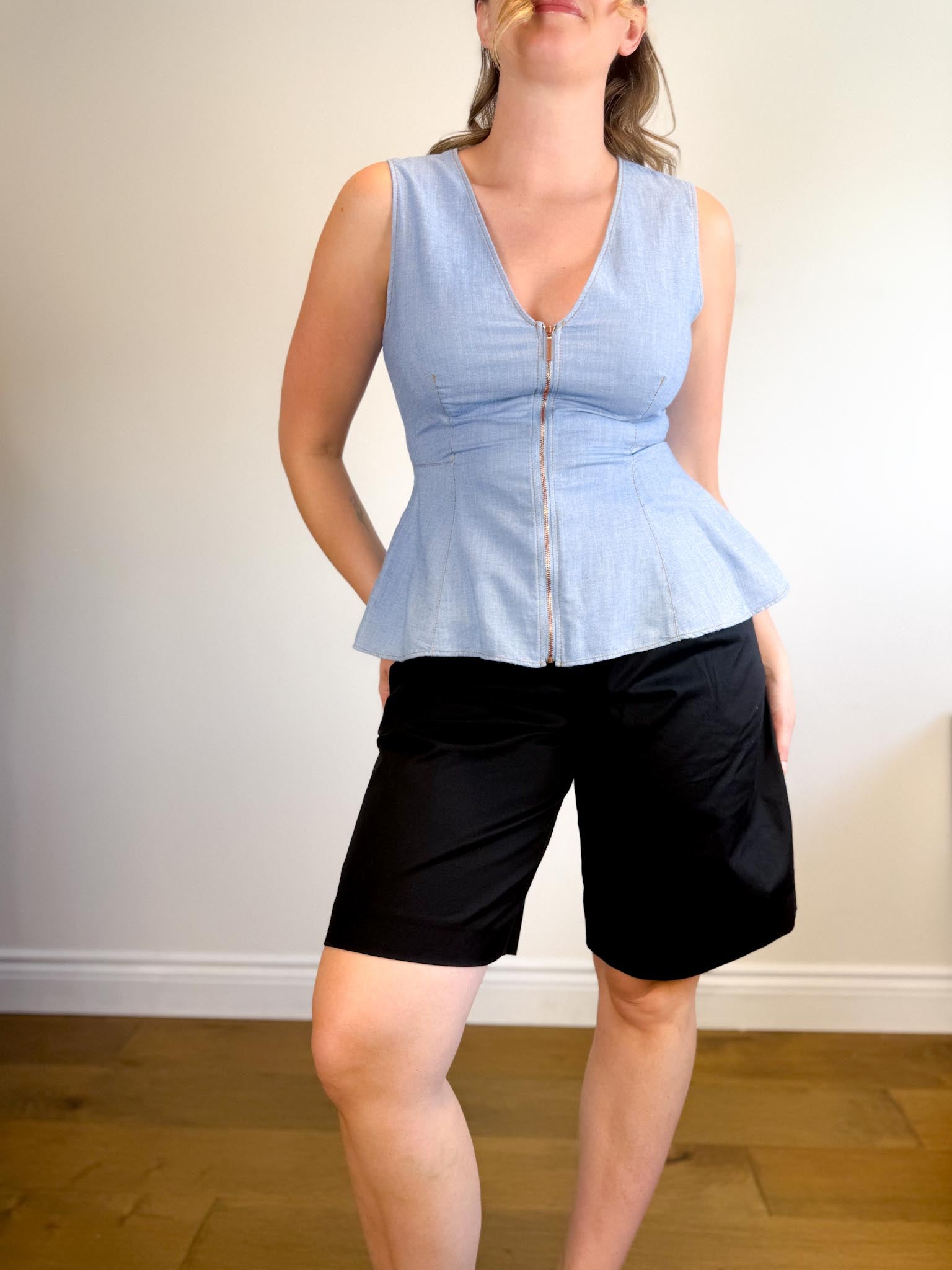 The sleeveless Punctual top is perfect for creating a style that is both elegant and modern. Made of cotton reminiscent of a faded denim canvas, this fitted top has a peplum at the hips. It also has a sensual pronounced V-neckline on the front and back as well as contrasting stitching. Wear it over jeans for a total denim look or with a lace midi skirt for a distinguished summer look.