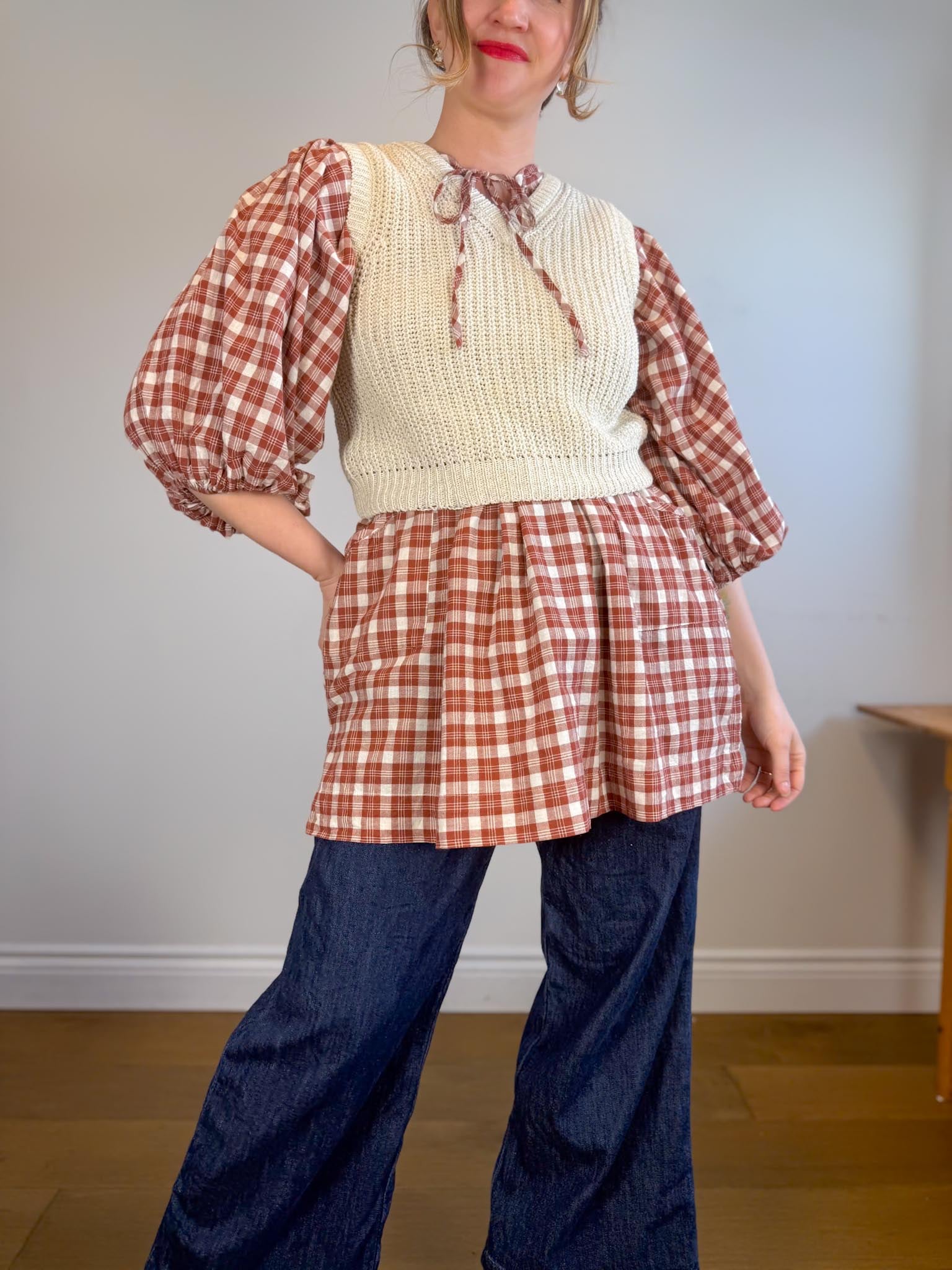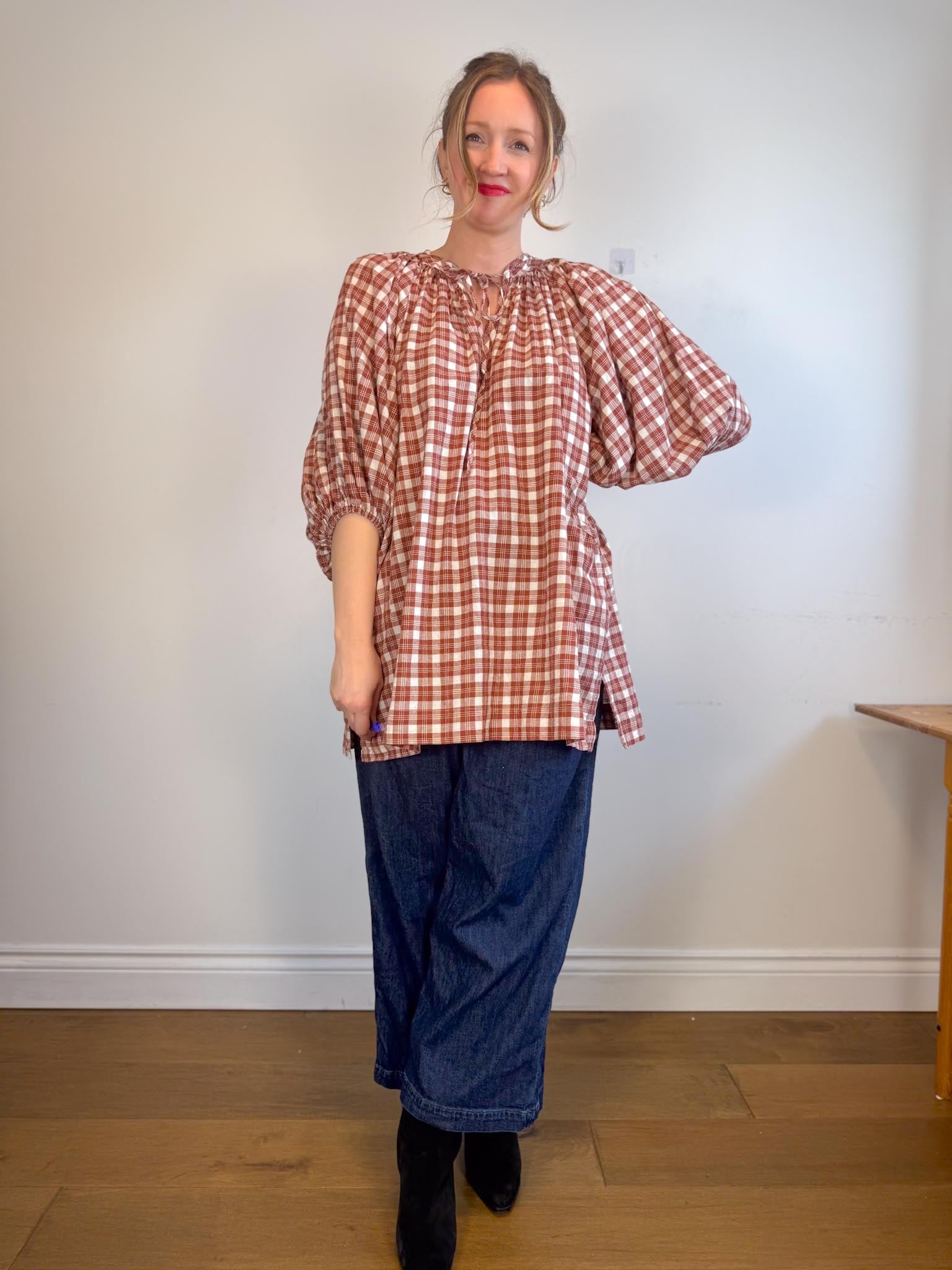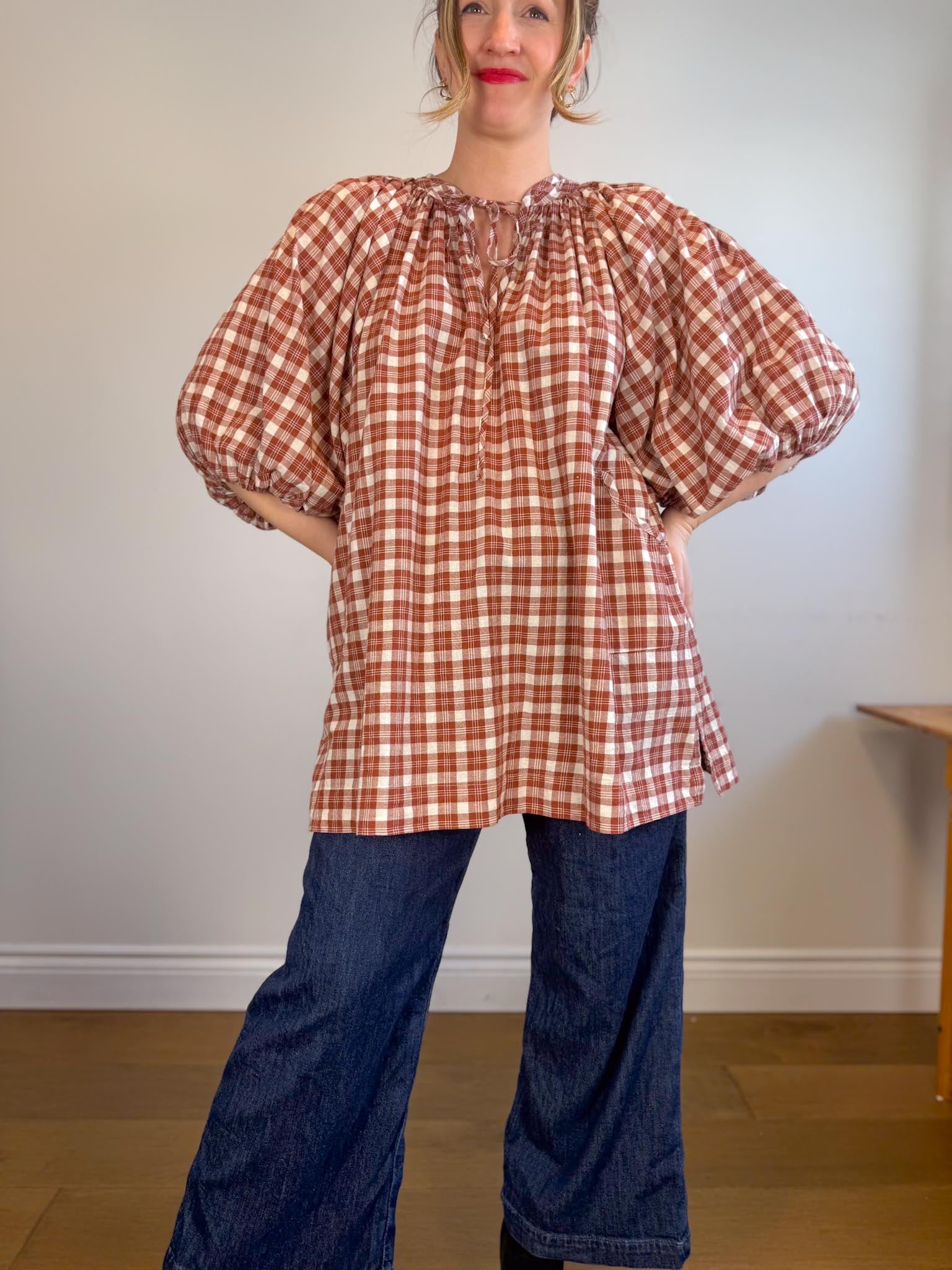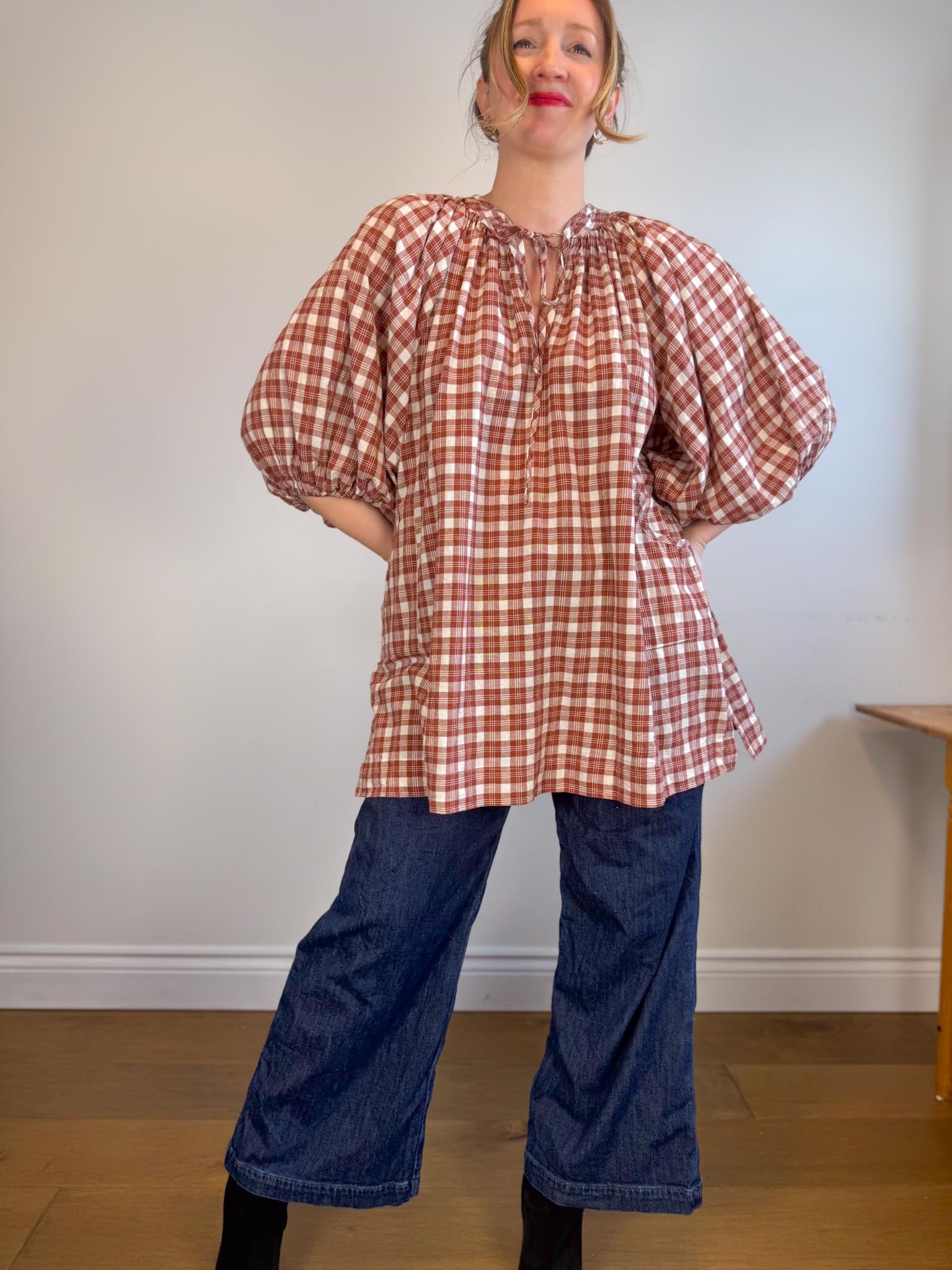 Offering a warm red clay colour-way contrasted with classic off-white tones, this intentionally oversized mini length design features a poet-style collar with optional tie, romantic billowy sleeves finished with soft elasticated cuffs and pockets at the hip.