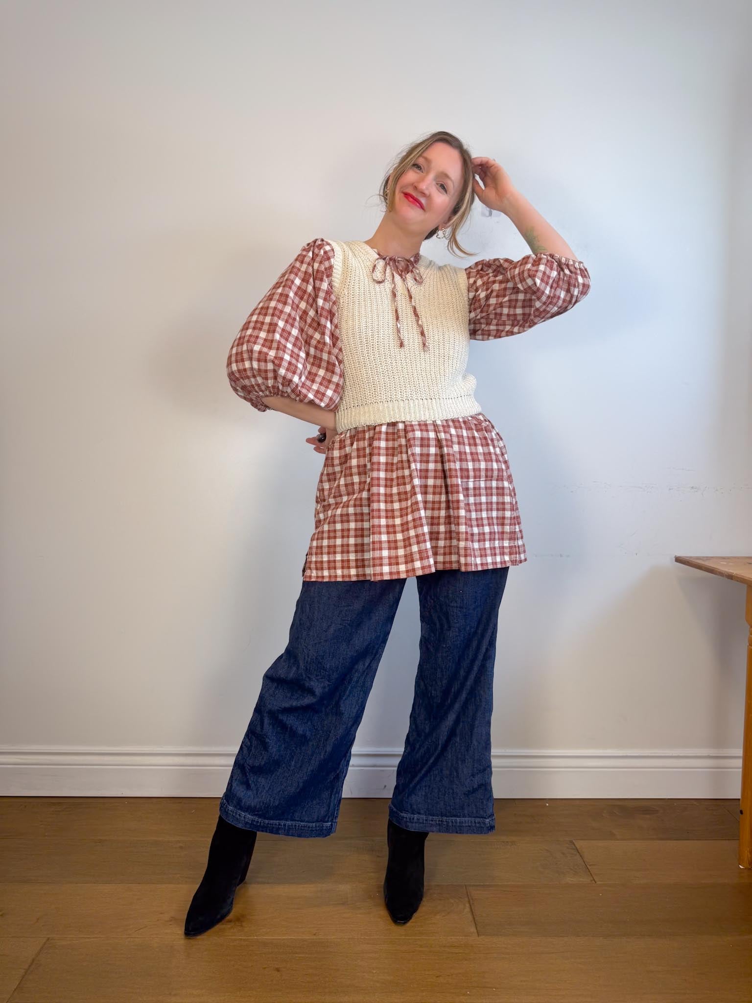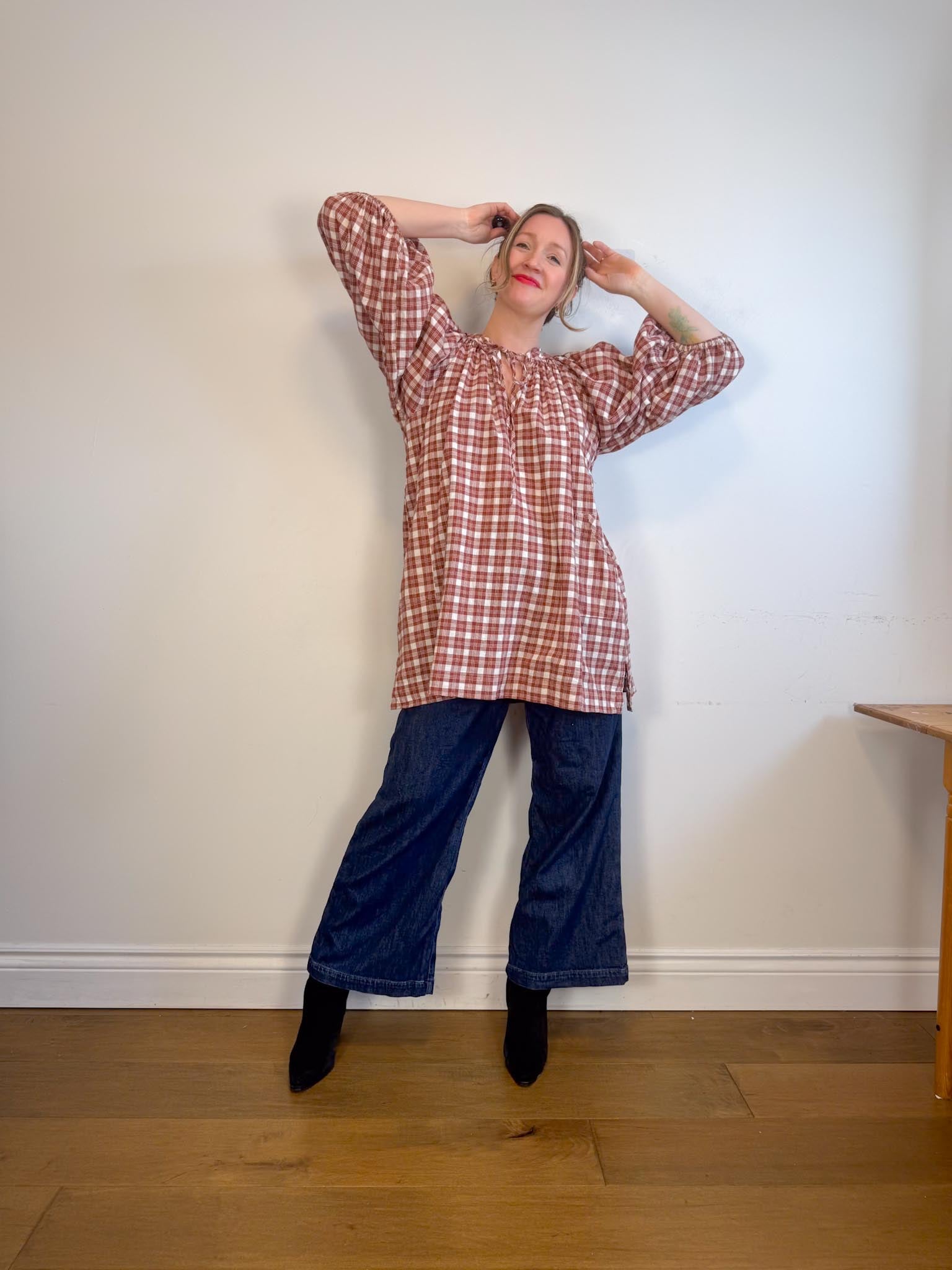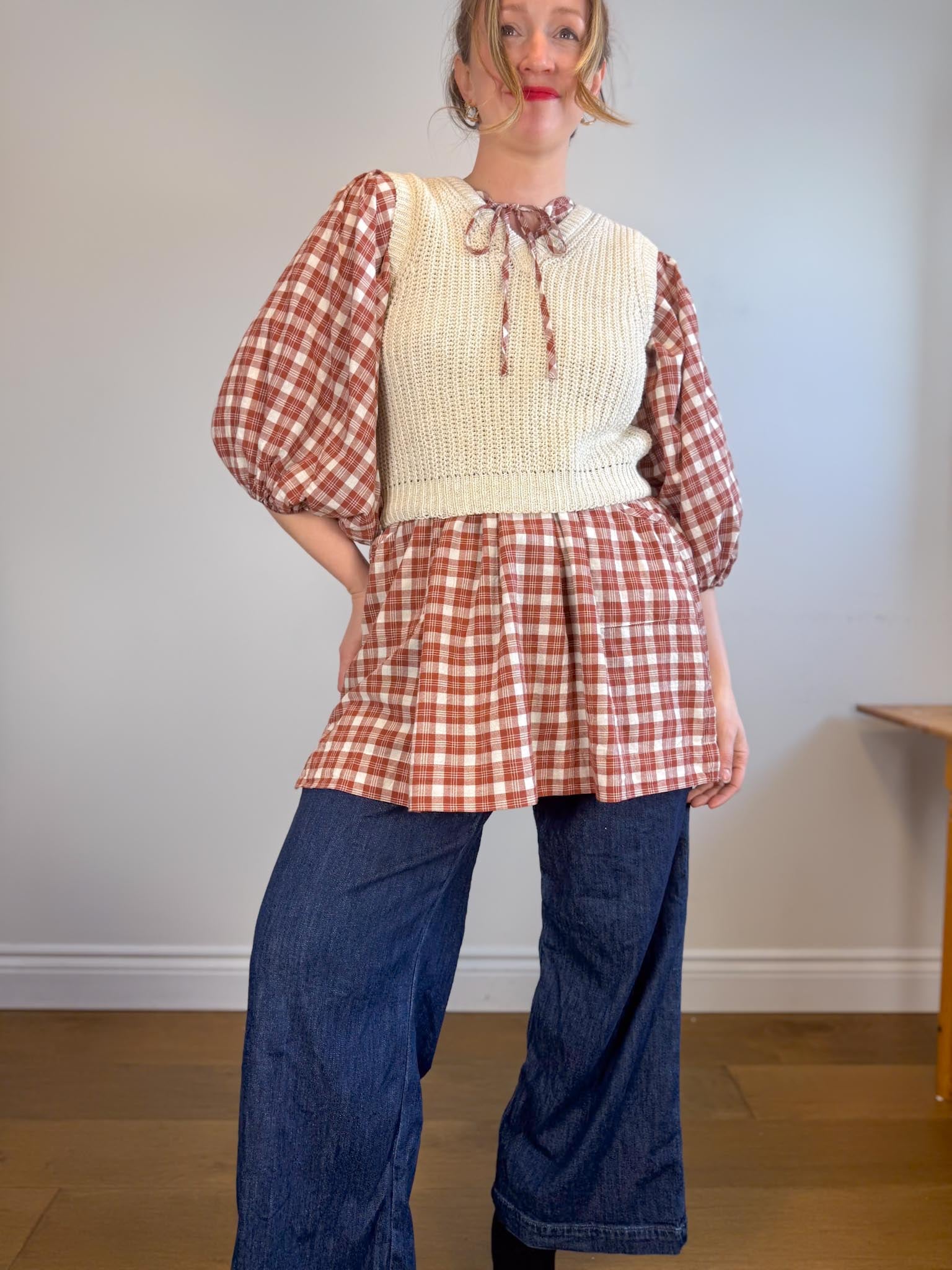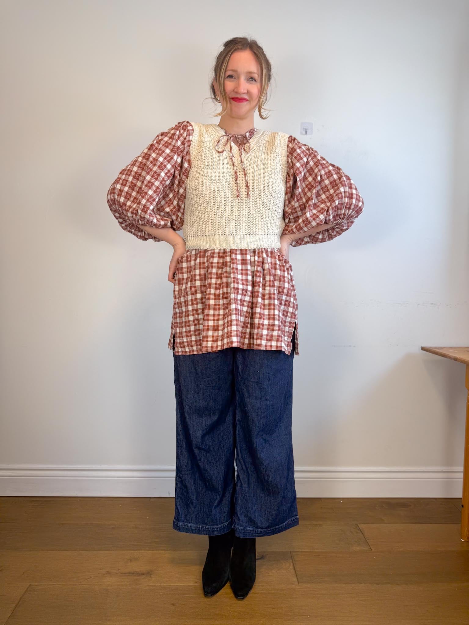 Offering a warm red clay colour-way contrasted with classic off-white tones, this intentionally oversized mini length design features a poet-style collar with optional tie, romantic billowy sleeves finished with soft elasticated cuffs and pockets at the hip.