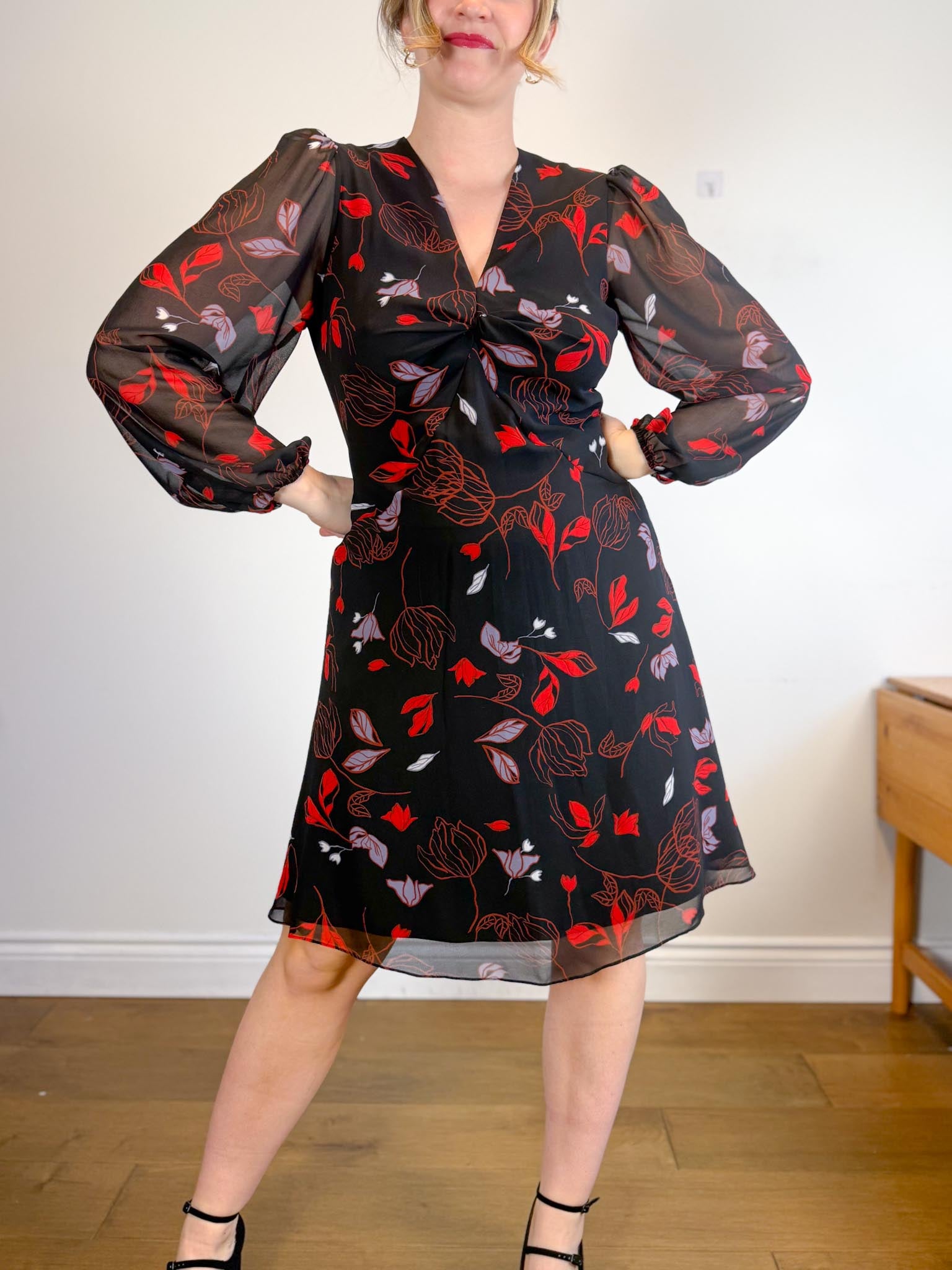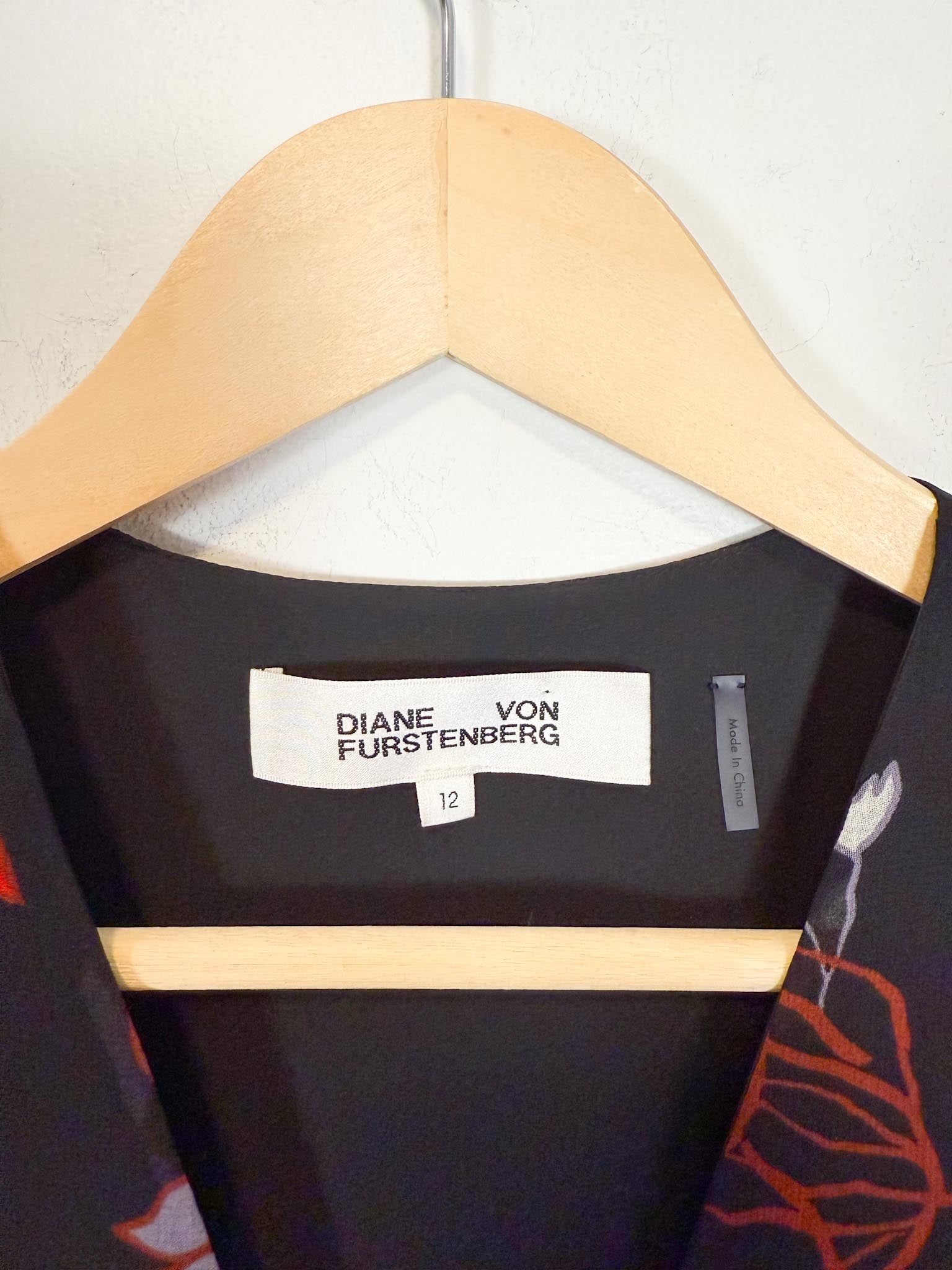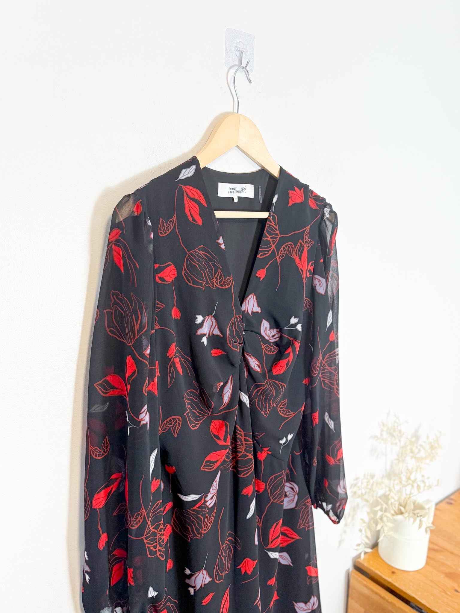 Diane Von Furstenberg "Kala Chiffon Long Sleeve Flare Dress in Black/Red Floral" (Size 12)