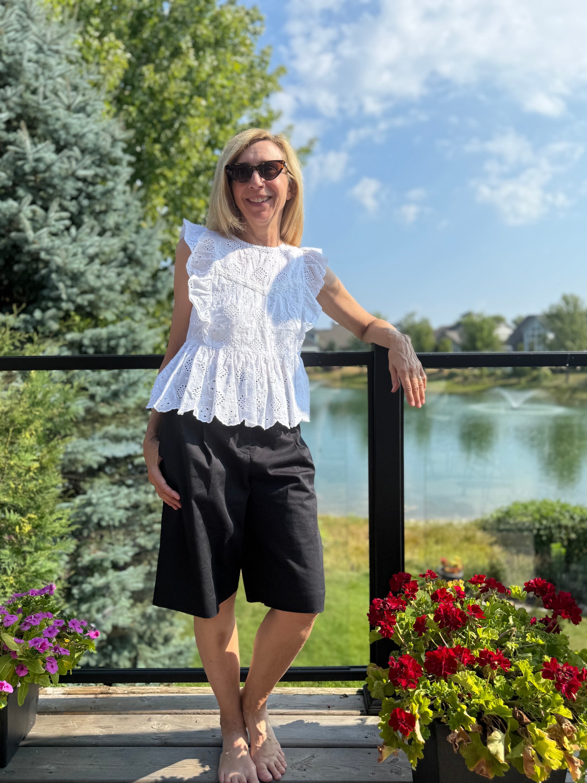 For sizing reference in the photos above, I am 5’9 and usually wear a M-L in tops and a size L / 10-12 depending on the brand in bottoms. My measurements are as follows: bust is 37/38” waist is 32” and hips are 43”. My Mom is 5’5 and usually wears a size small in tops and size 4 in bottoms depending on the brand. Her measurements are as follows: bust is 32” , her waist is 28” and her hips are 36.5”.