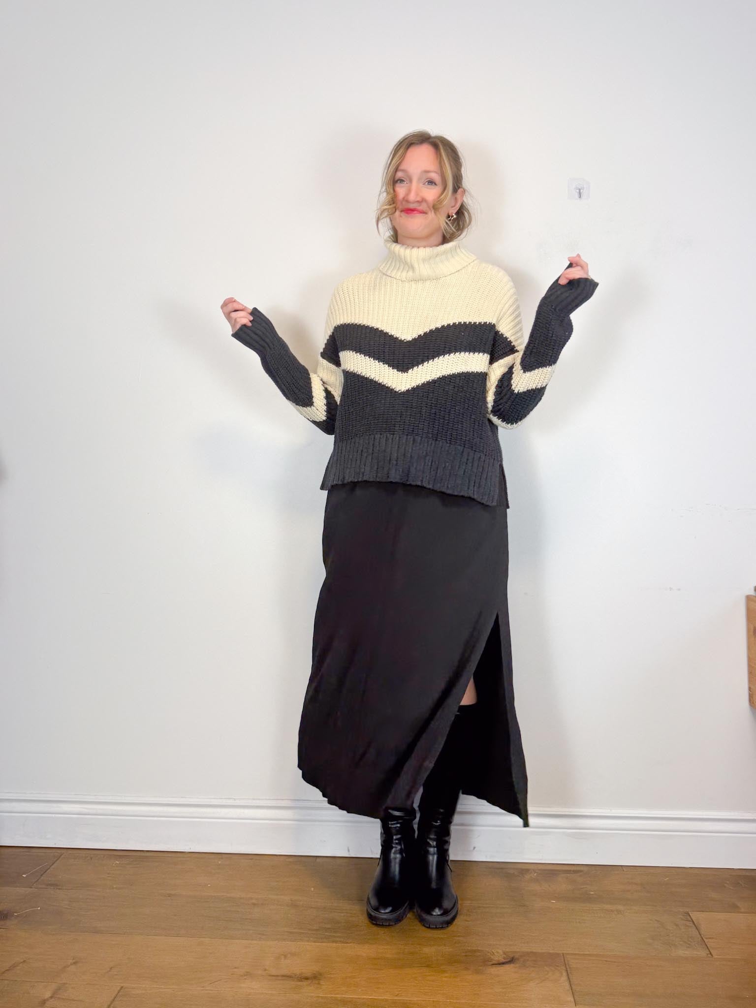 For sizing reference in the photos above, I am 5’9 and usually wear a M-L in tops and a size L / 10-12 depending on the brand in bottoms. My measurements are as follows: bust is 37/38” waist is 32” and hips are 43”. My Mom is 5’5 and usually wears a size small in tops and size 4 in bottoms depending on the brand. Her measurements are as follows: bust is 32” , her waist is 28” and her hips are 36.5”.