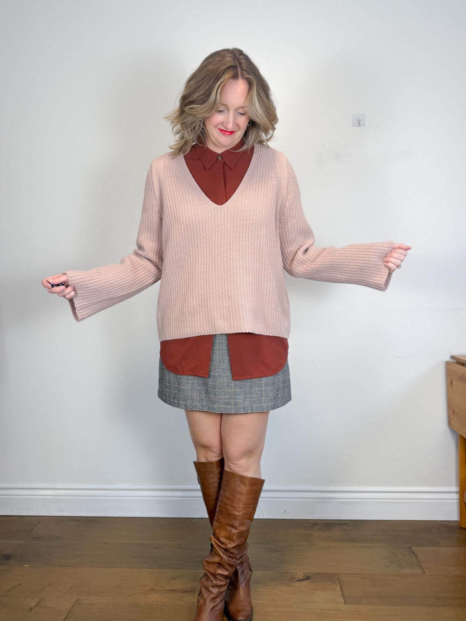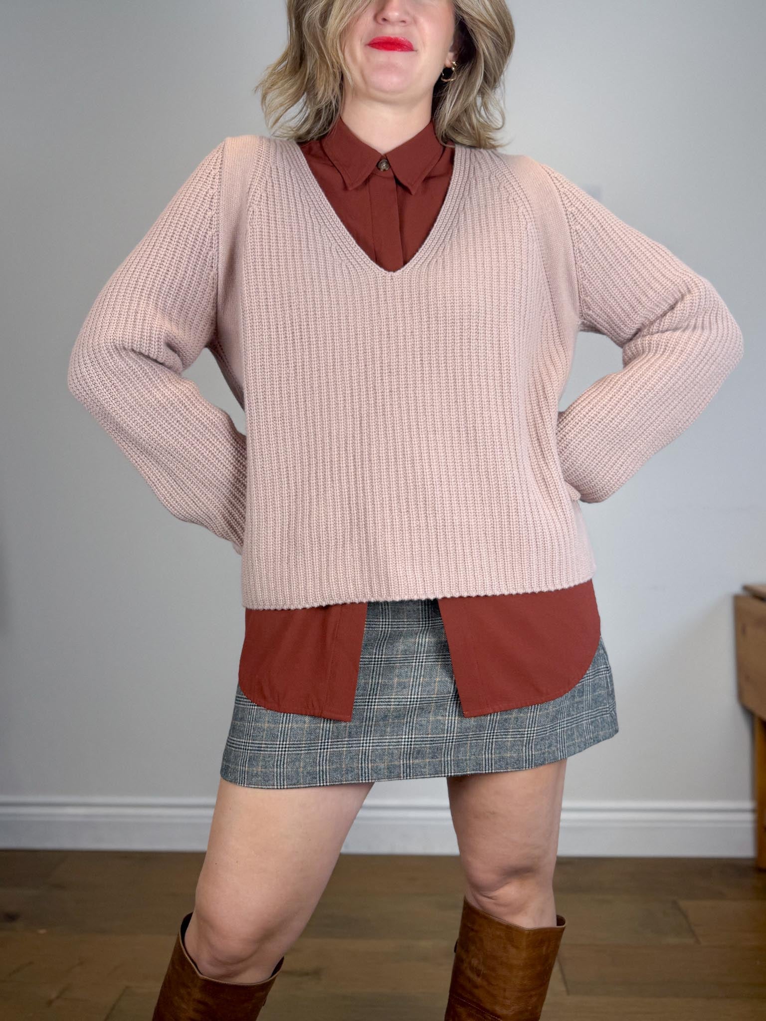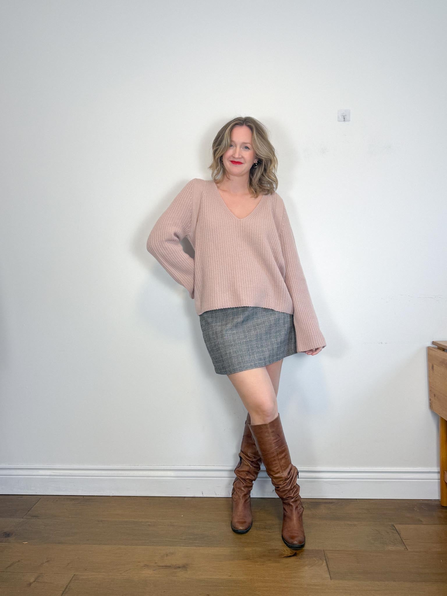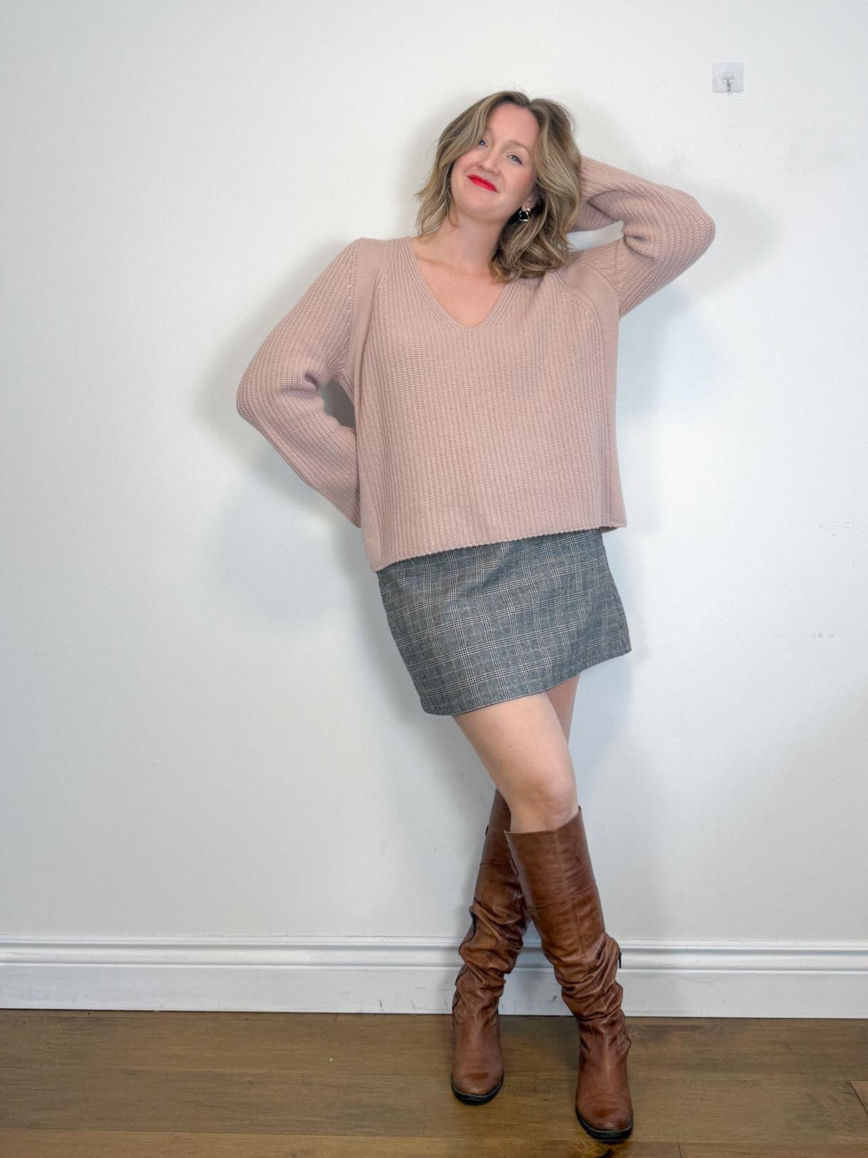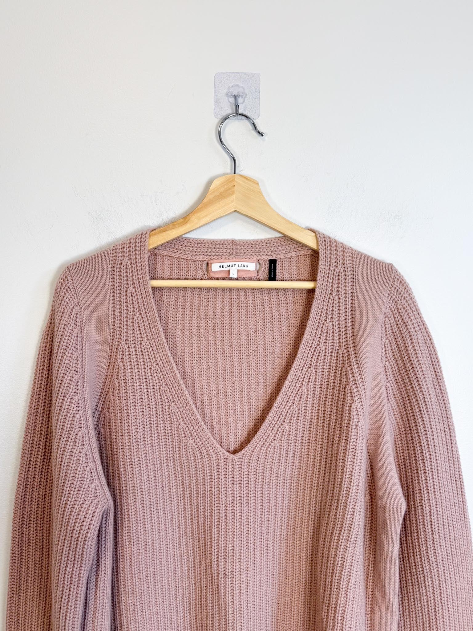 HELMUT LANG Designer Wool & Cashmere V-Neck Knit Sweater in Dusty Rose (Size L)
