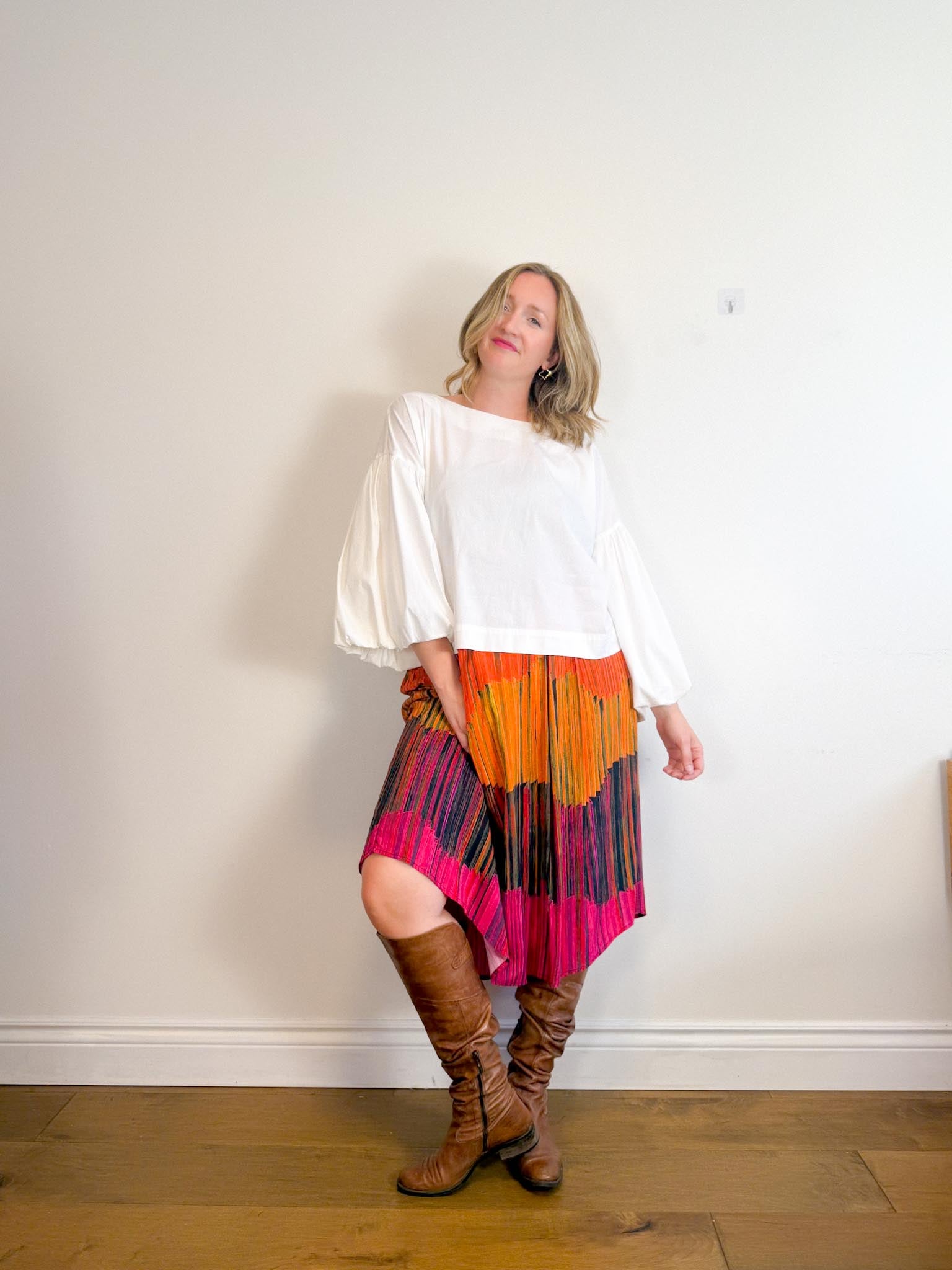 For sizing reference in the photos above, I am 5’9 and usually wear a M-L in tops and a size L / 10-12 depending on the brand in bottoms. My measurements are as follows: bust is 37/38” waist is 32” and hips are 43”. My Mom is 5’5 and usually wears a size small in tops and size 4 in bottoms depending on the brand. Her measurements are as follows: bust is 32” , her waist is 28” and her hips are 36.5”.