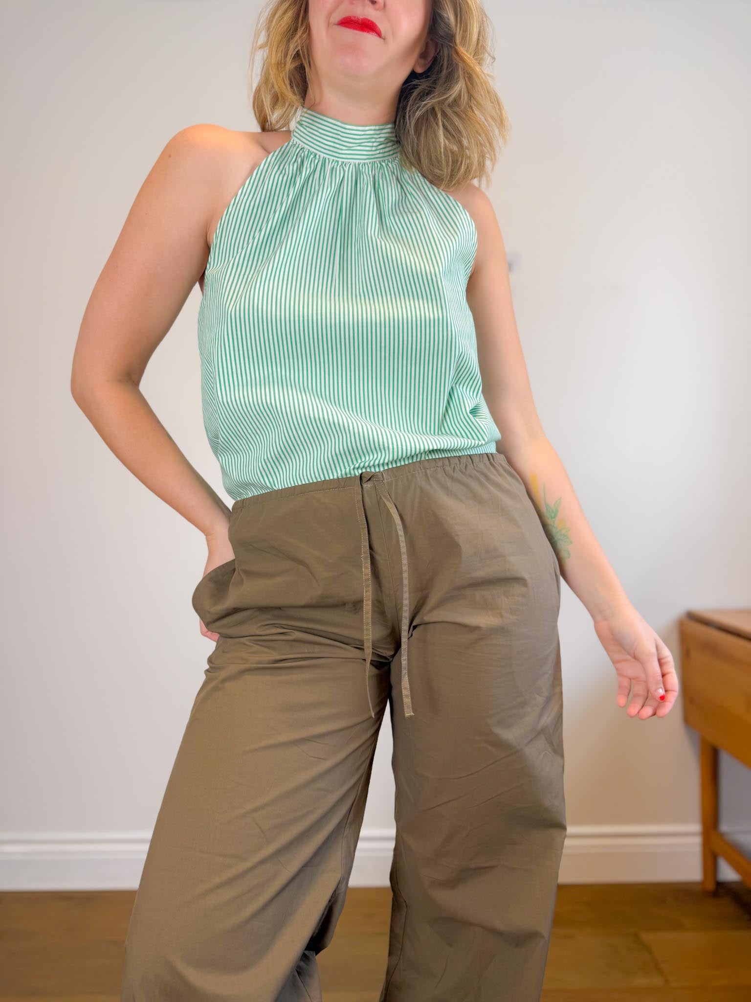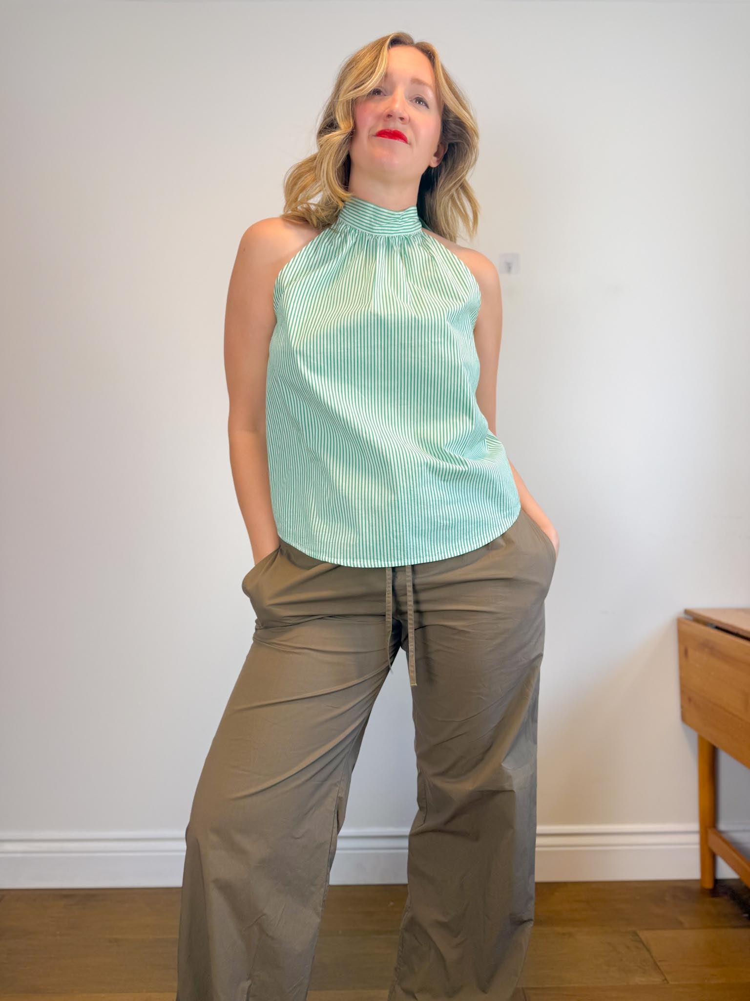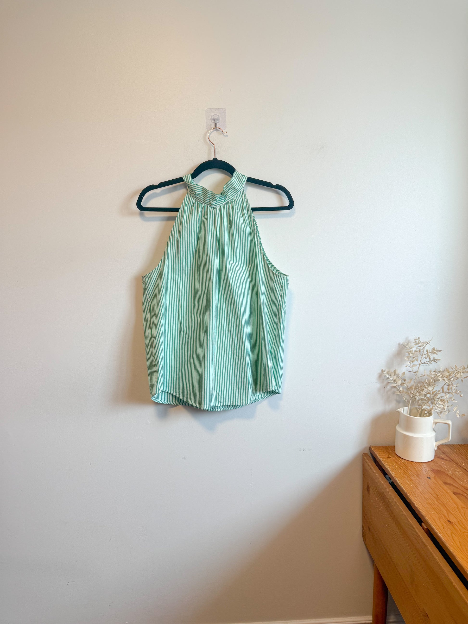 J.Crew "Tie-Neck Poplin Cotton Top in Green/White" (Size 10)