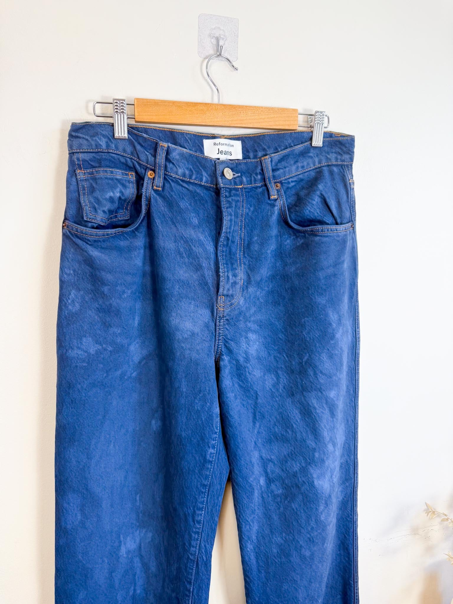 Reformation "Val 90s Mid Rise Straight Jeans in Tie Dye Blue" (Size 29)