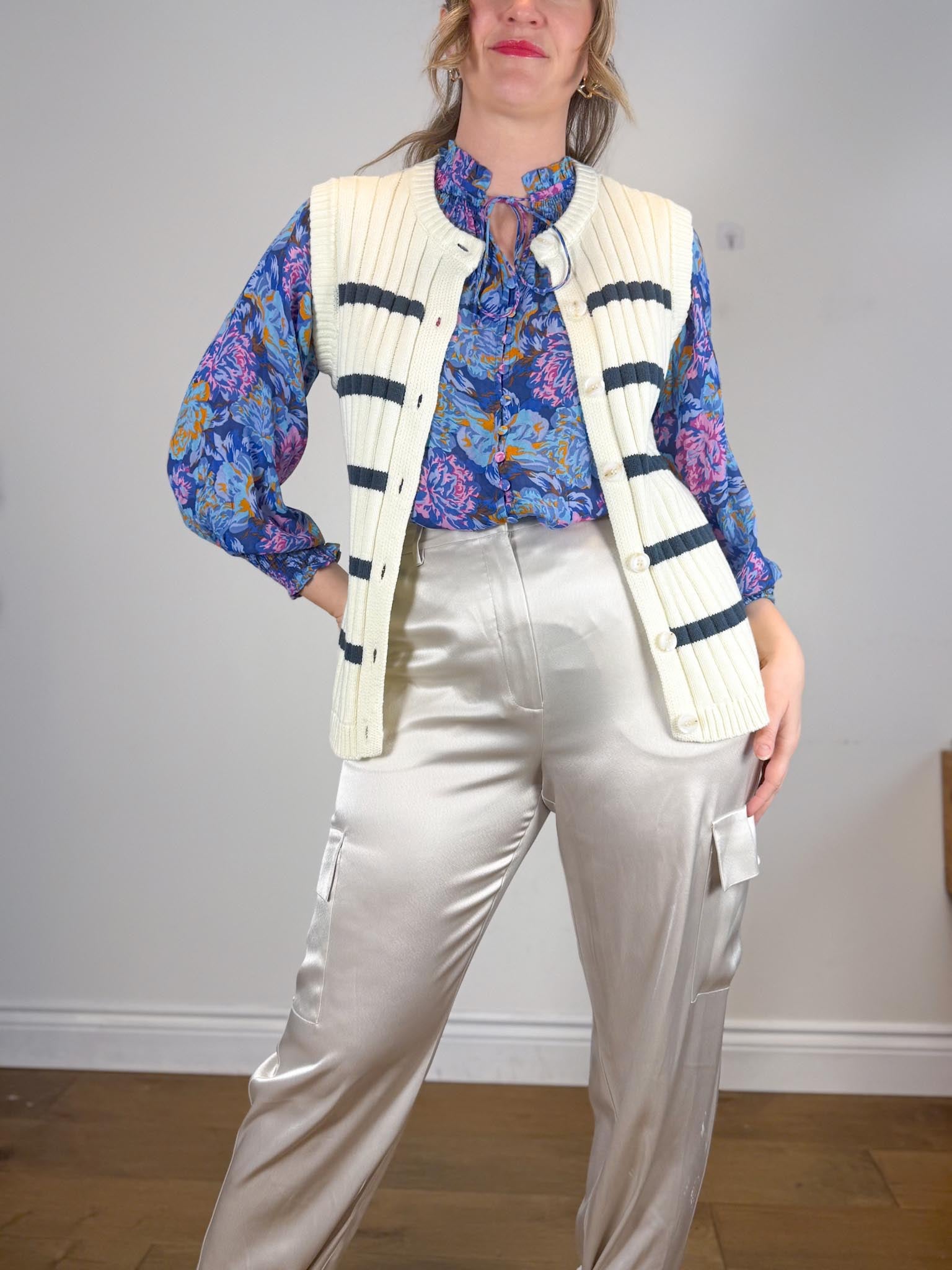 - Blue floral printed blouse - Tie collar - Long sleeve w/ elastic cuff