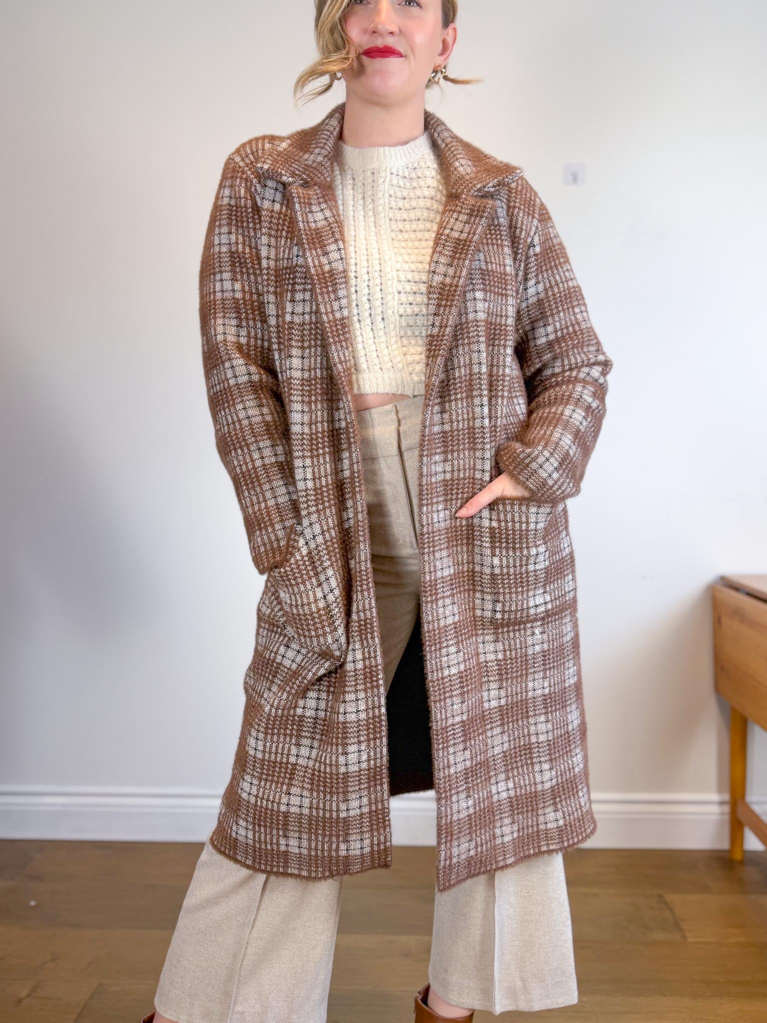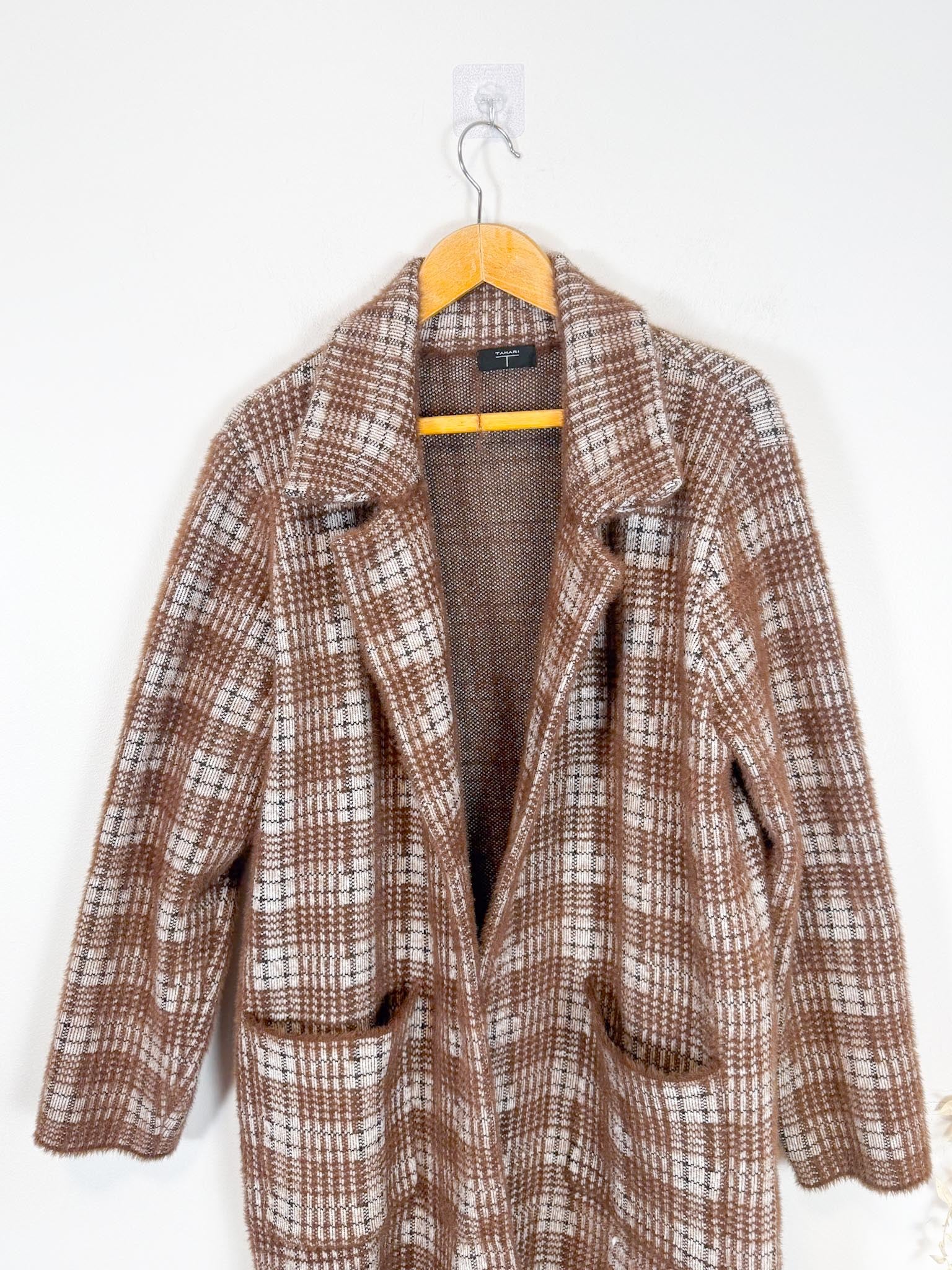 TAHARI Long Plaid Shacket in Brown/White (Size L)