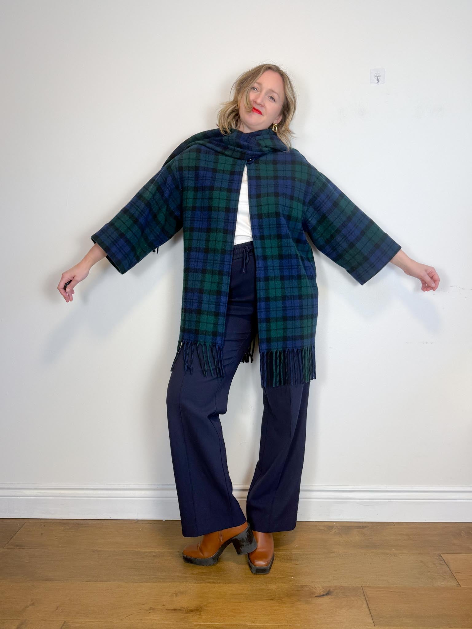 Vintage Plaid Wool Coat with Attached Scarf & Fringe (Size L)