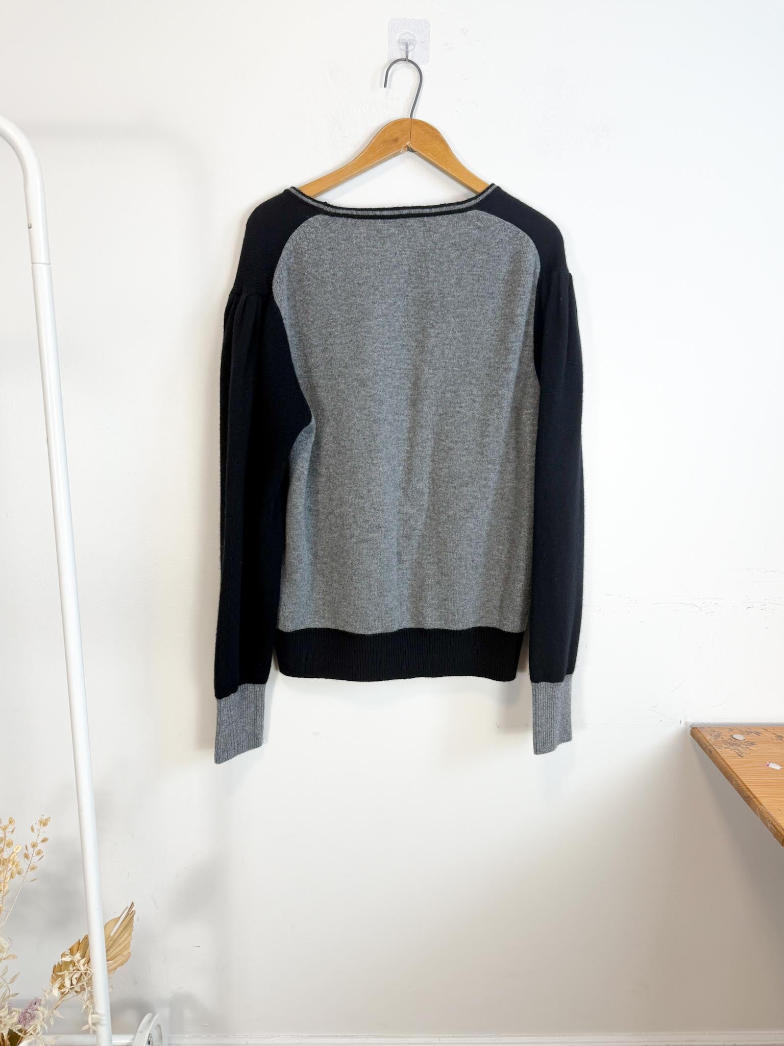 - Long sleeve wool and cashmere-blend cardigan colorblocked in black and grey. Rib knit Y-neck collar, cuffs, and hem. Button closure at front.Supplier color: Black/Grey